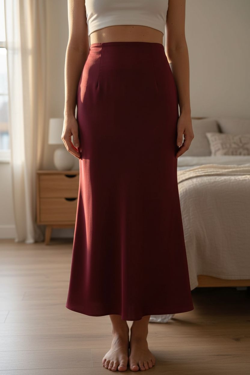 Jupe longue épaisse taille sirène rouge bordeaux debout, face à la caméra, dans une chambre à la lumière douce, avec une lumière naturelle filtrant par la fenêtre.