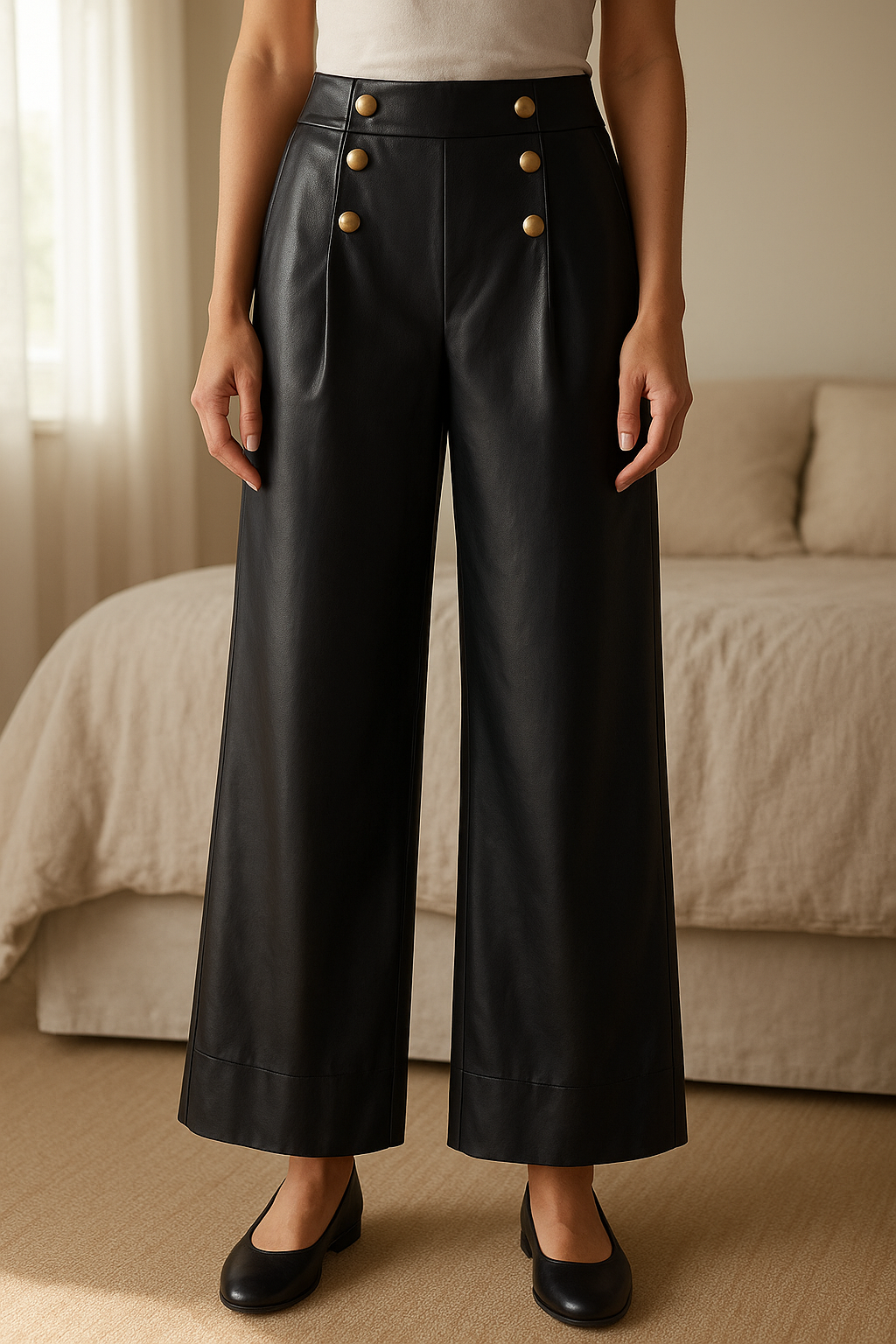 Jupe longue simili cuir debout, face à la caméra, dans une chambre à la lumière douce, avec une lumière naturelle filtrant par la fenêtre.