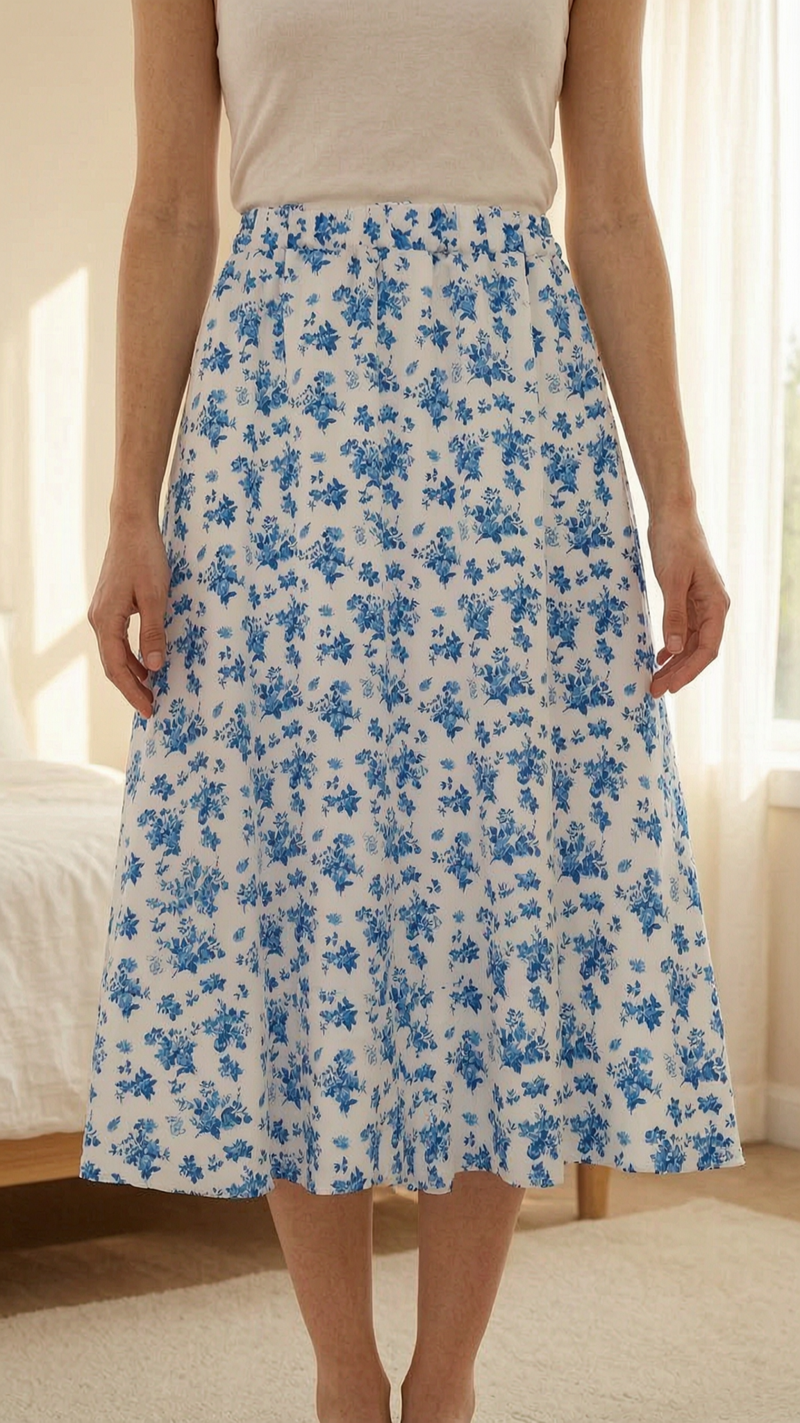 Jupe mi-longue fleurie, été, bohème debout, face à la caméra, dans une chambre à la lumière douce, avec une lumière naturelle filtrant par la fenêtre.