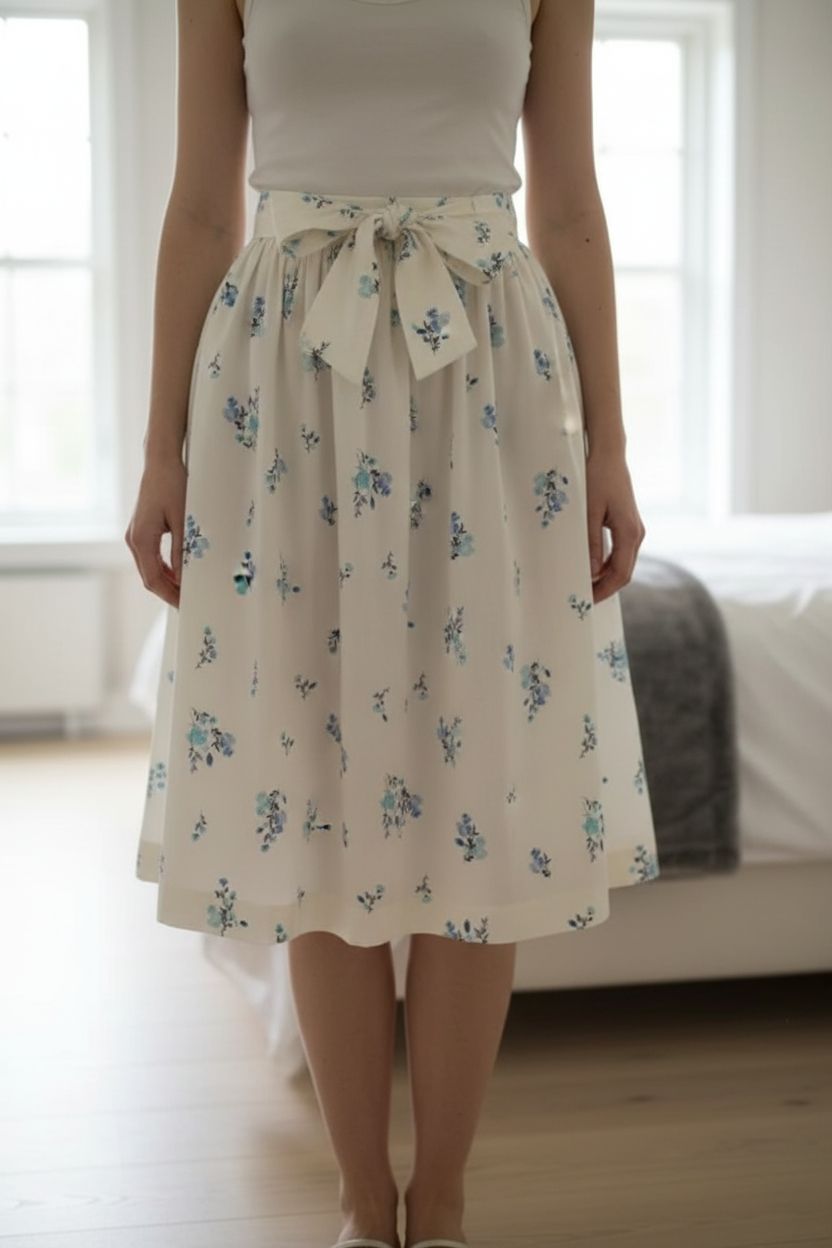 Jupe NAF NAF debout, face à la caméra, dans une chambre à la lumière douce, avec une lumière naturelle filtrant par la fenêtre.