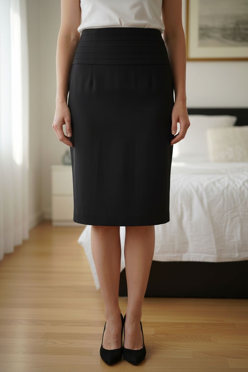 Jupe noire ceintrée HetM T36 debout, face à la caméra, dans une chambre à la lumière douce, avec une lumière naturelle filtrant par la fenêtre.