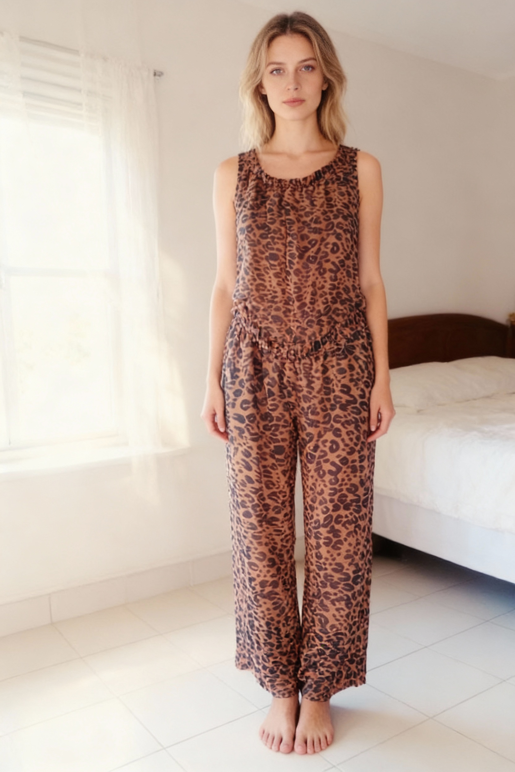 Jupe plissée longue léopard marron/orangé debout, face à la caméra, dans une chambre à la lumière douce, avec une lumière naturelle filtrant par la fenêtre.