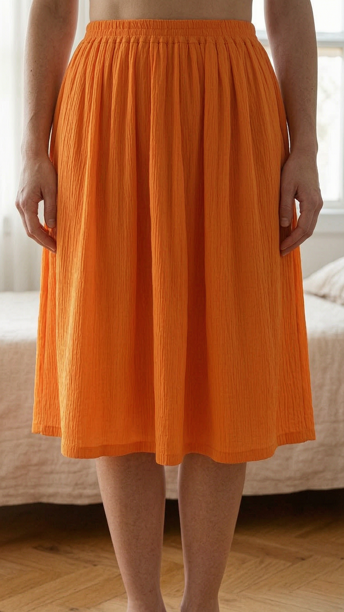 jupe vintage 3 suisses taille 38/40 debout, face à la caméra, dans une chambre à la lumière douce, avec une lumière naturelle filtrant par la fenêtre.