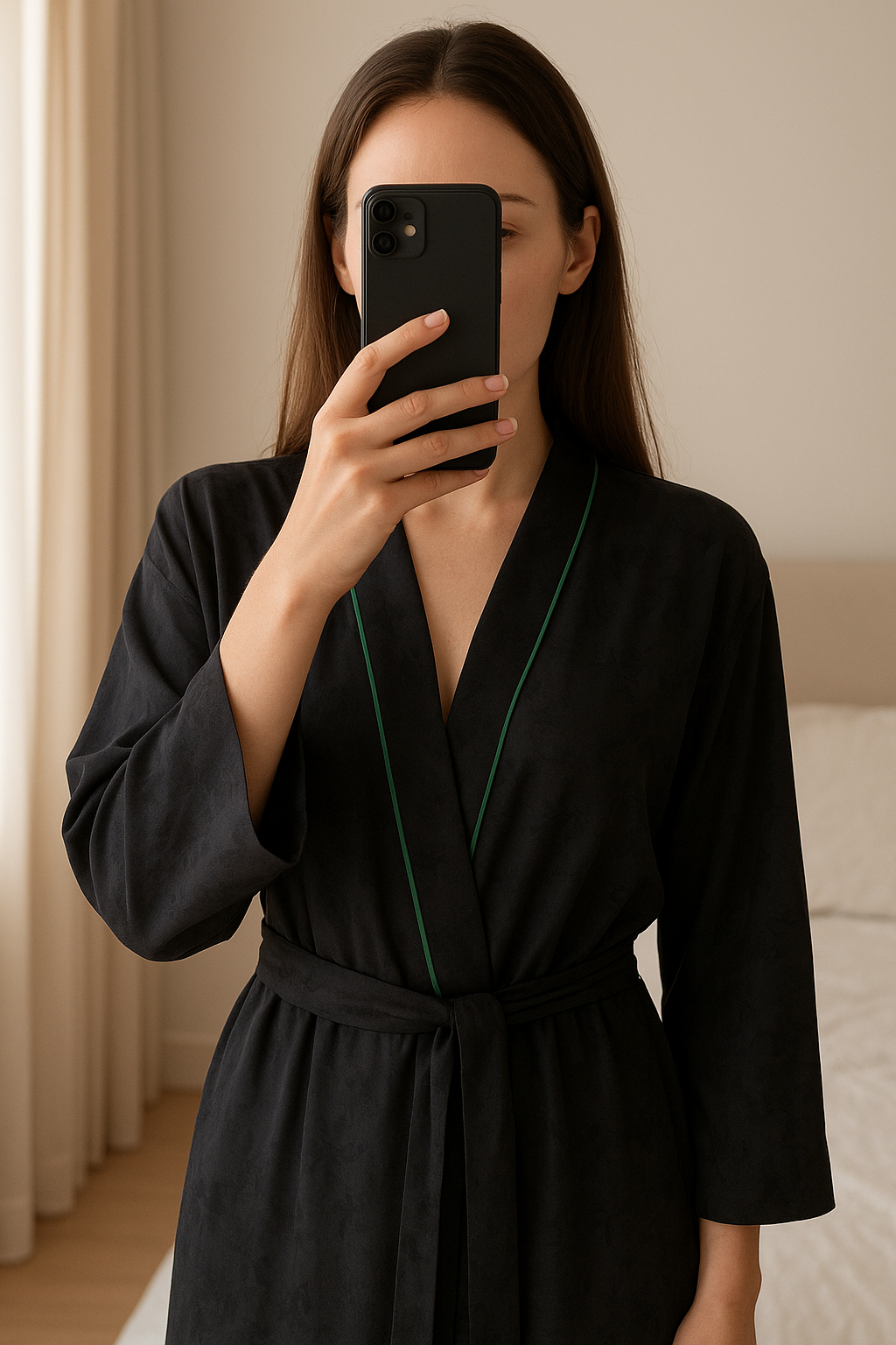 Kimono Maje noire neuf manches longues taille 1 debout, face à la caméra, dans une chambre à la lumière douce, avec une lumière naturelle filtrant par la fenêtre.