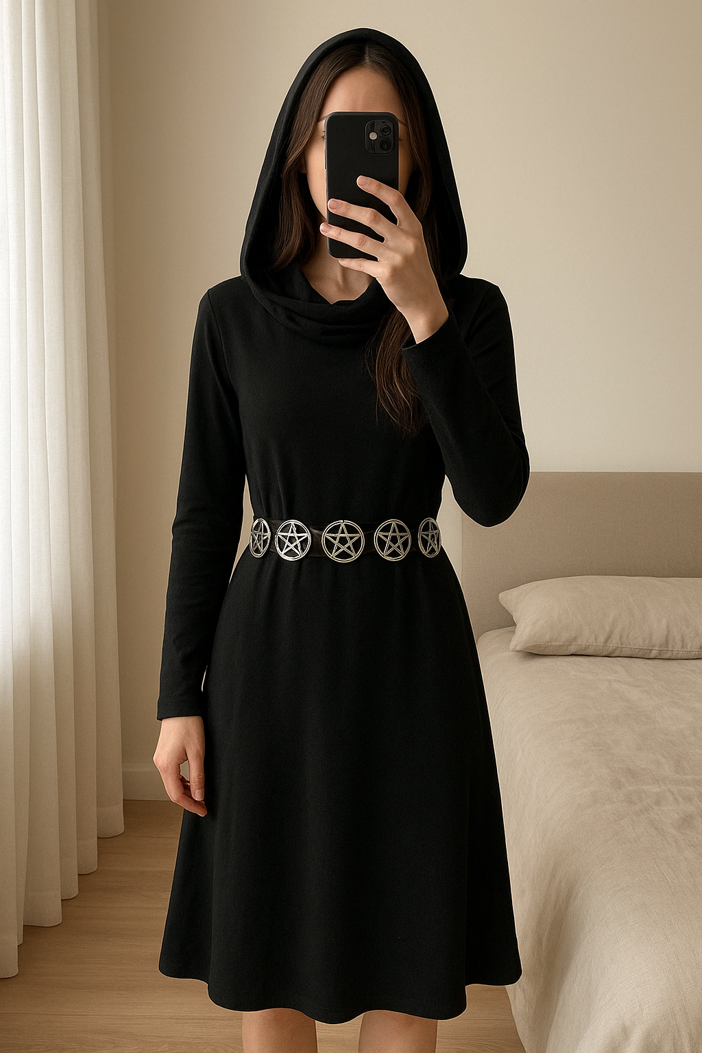 Langes weiches schwarze Kleid aufrecht stehend, der Kamera zugewandt, in einem sanft beleuchteten Schlafzimmer, mit natürlichem Licht, das durch ein Fenster fällt.