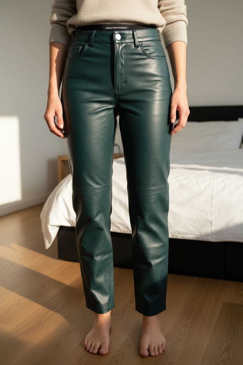 Lederhose dunkelgrün Young Poets Society aufrecht stehend, der Kamera zugewandt, in einem sanft beleuchteten Schlafzimmer, mit natürlichem Licht, das durch ein Fenster fällt.