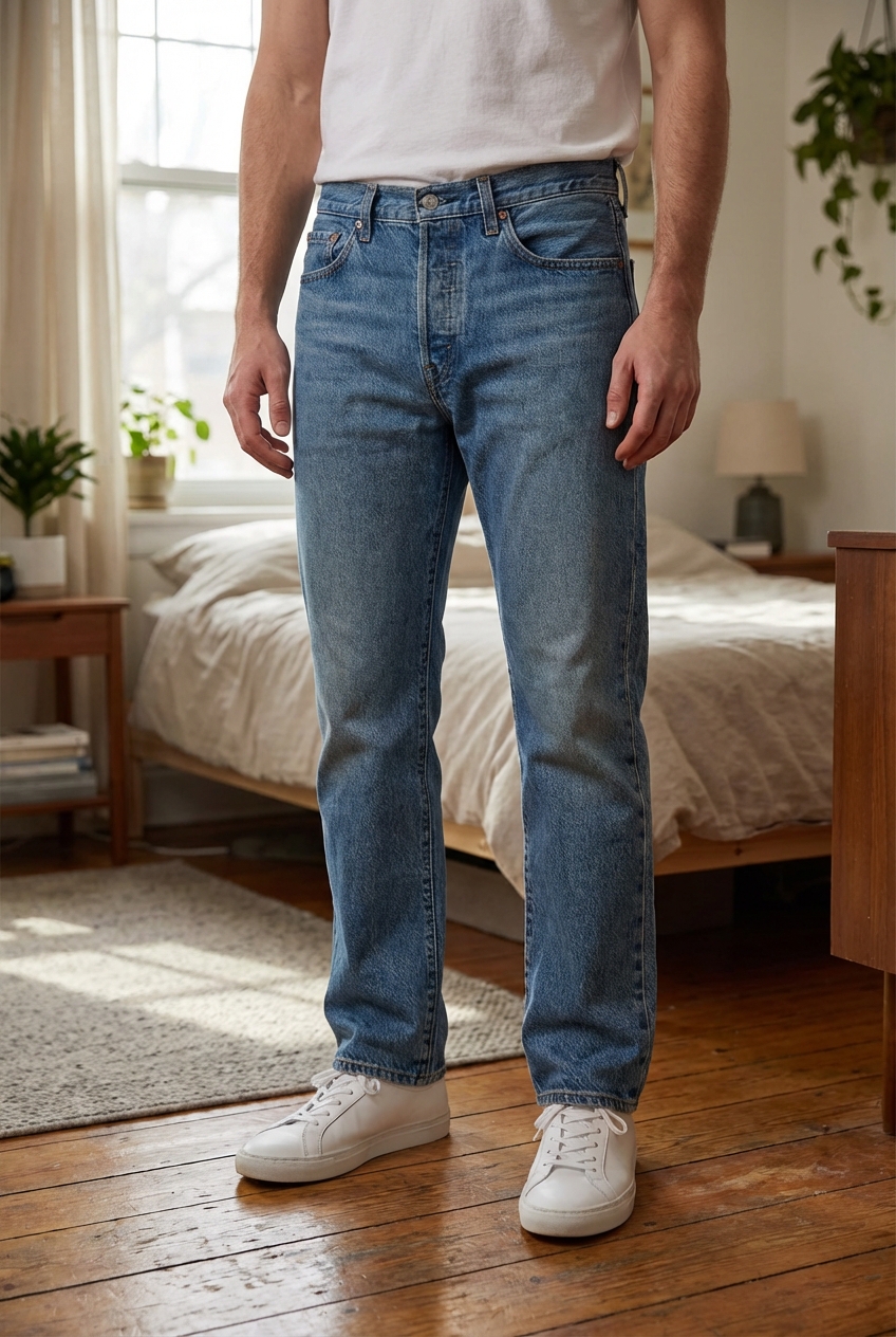 Levi’s 501 Original – W30 L30 – Bleu – Coupe droite – Très bon état #014 debout, face à la caméra, dans une chambre à la lumière douce, avec une lumière naturelle filtrant par la fenêtre.