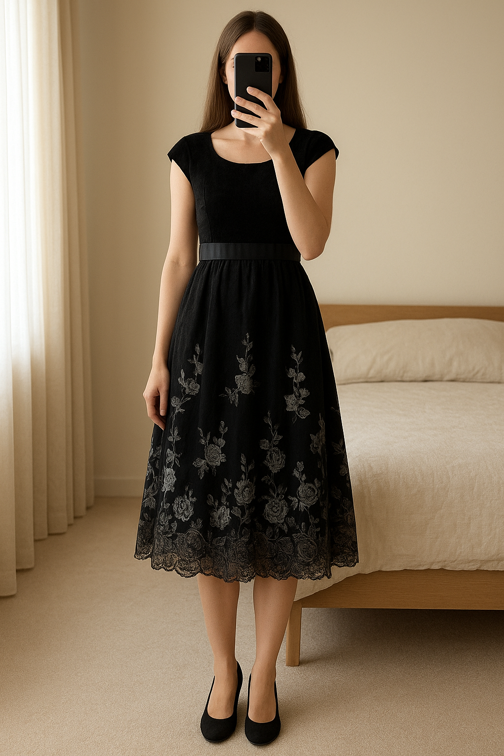 Little black dress corto Vestito elegante Nuna Lie in velluto nero con ricami floreali in piedi, rivolto verso la fotocamera, in una camera da letto con luce soffusa e luce naturale che filtra dalla finestra.