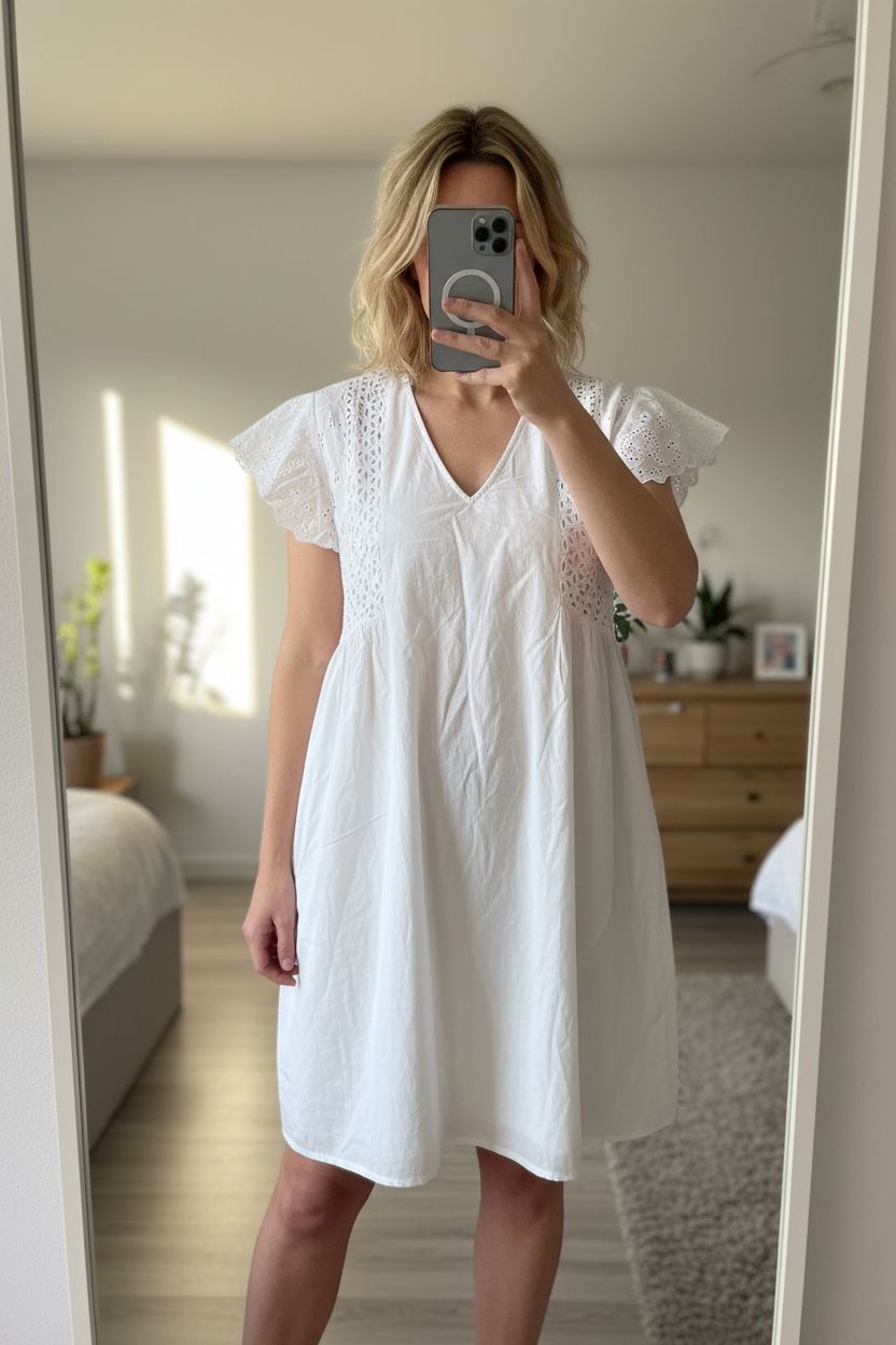 Longue robe blanche kaporal taille l debout, face à la caméra, dans une chambre à la lumière douce, avec une lumière naturelle filtrant par la fenêtre.