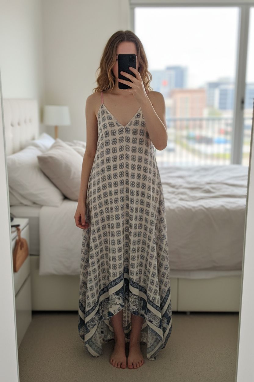 Longue robe taille L debout, face à la caméra, dans une chambre à la lumière douce, avec une lumière naturelle filtrant par la fenêtre.