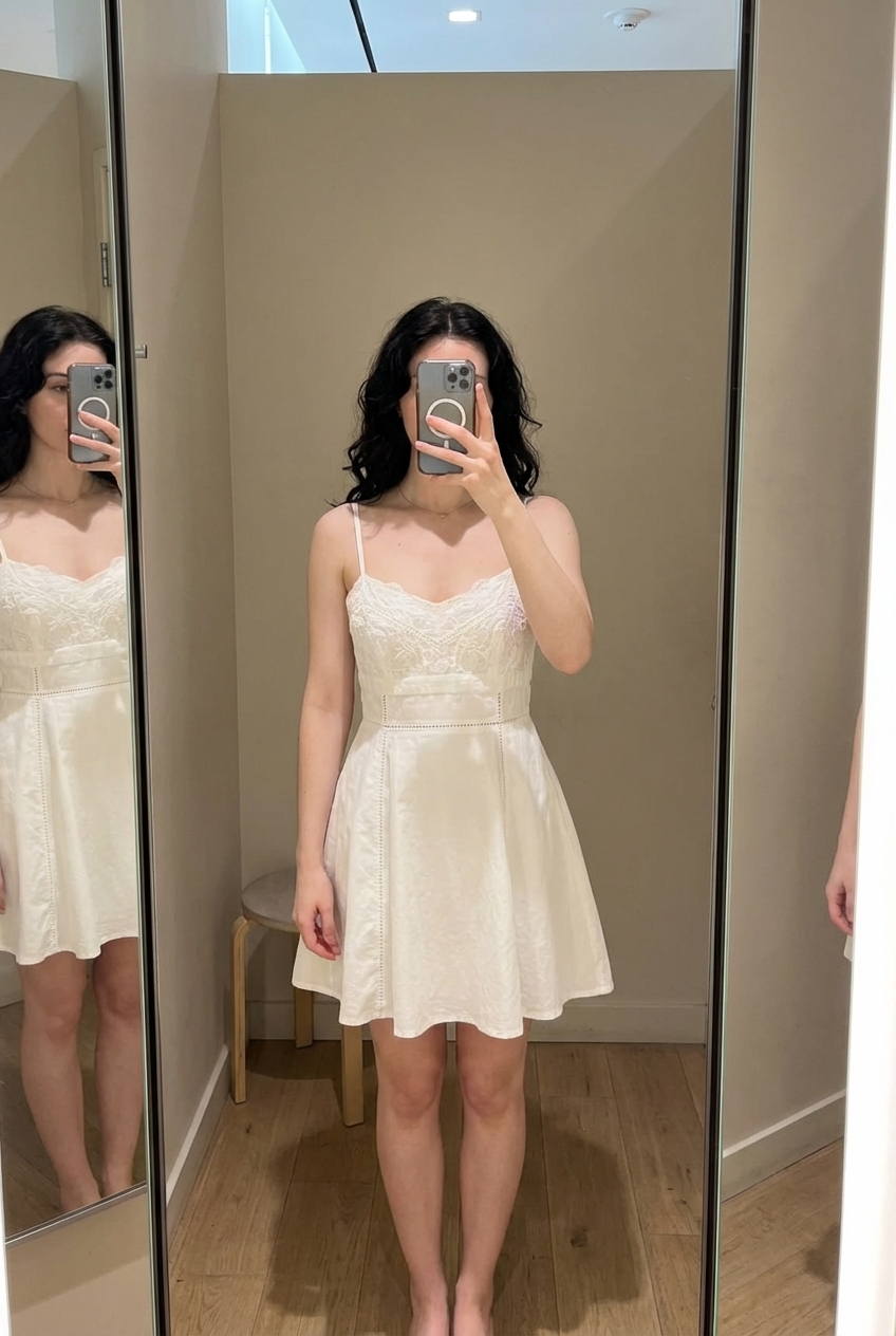 Une personne en Lot de 2 robes debout, face à la caméra, dans une cabine d’essayage de style boutique avec un miroir et une décoration neutre.