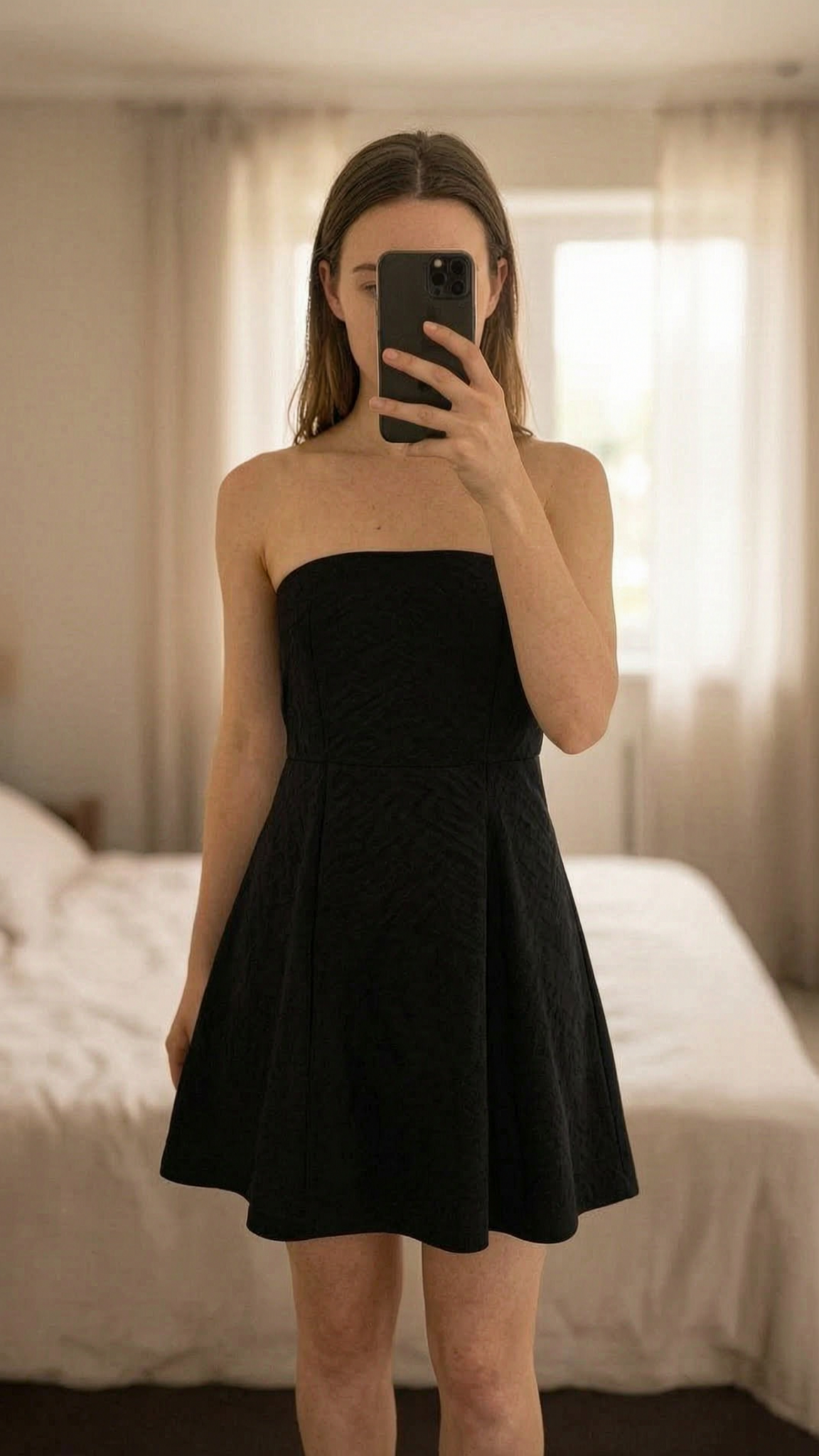 Lot robe bustier H&M texturées noir et blanche taille S debout, face à la caméra, dans une chambre à la lumière douce, avec une lumière naturelle filtrant par la fenêtre.