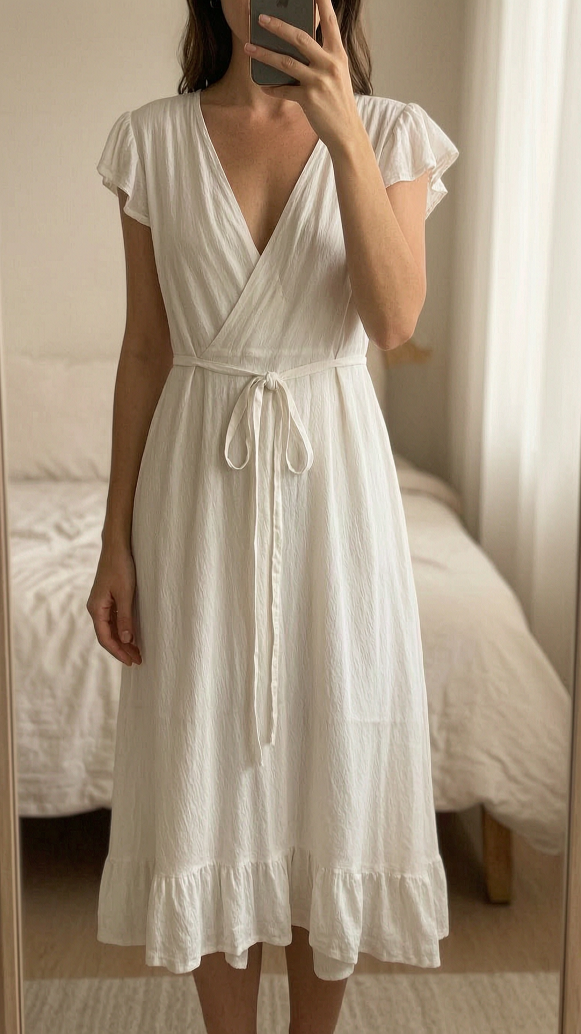 Magnifique robe porte-feuille debout, face à la caméra, dans une chambre à la lumière douce, avec une lumière naturelle filtrant par la fenêtre.