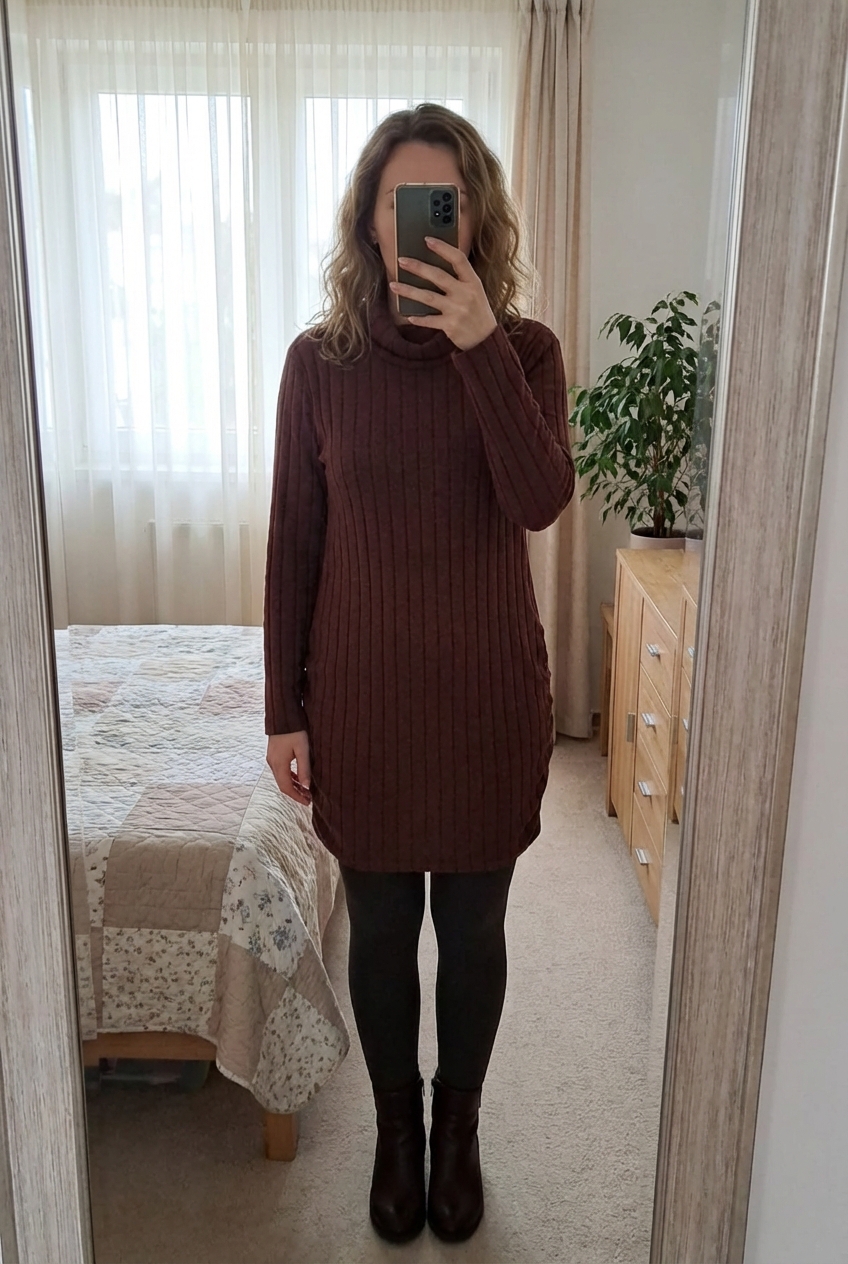 Magnifique robe pull marron taille M neuve debout, face à la caméra, dans une chambre à la lumière douce, avec une lumière naturelle filtrant par la fenêtre.