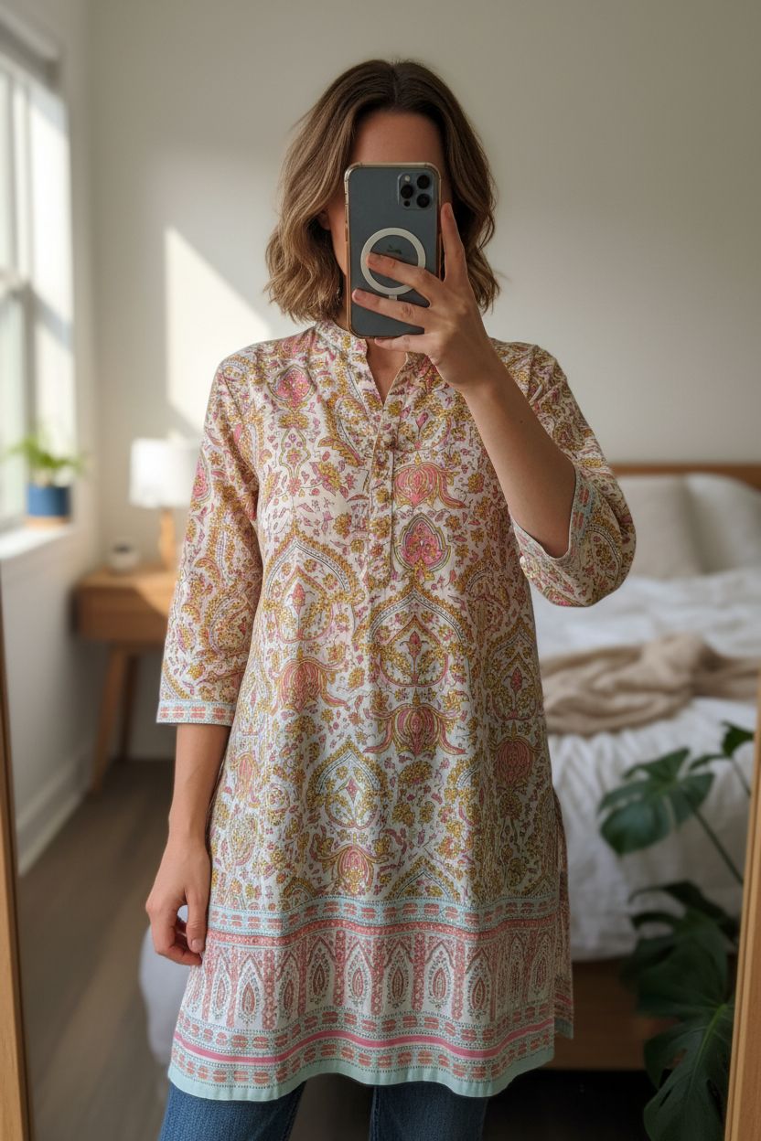 Magnifique tunique Anokhi debout, face à la caméra, dans une chambre à la lumière douce, avec une lumière naturelle filtrant par la fenêtre.