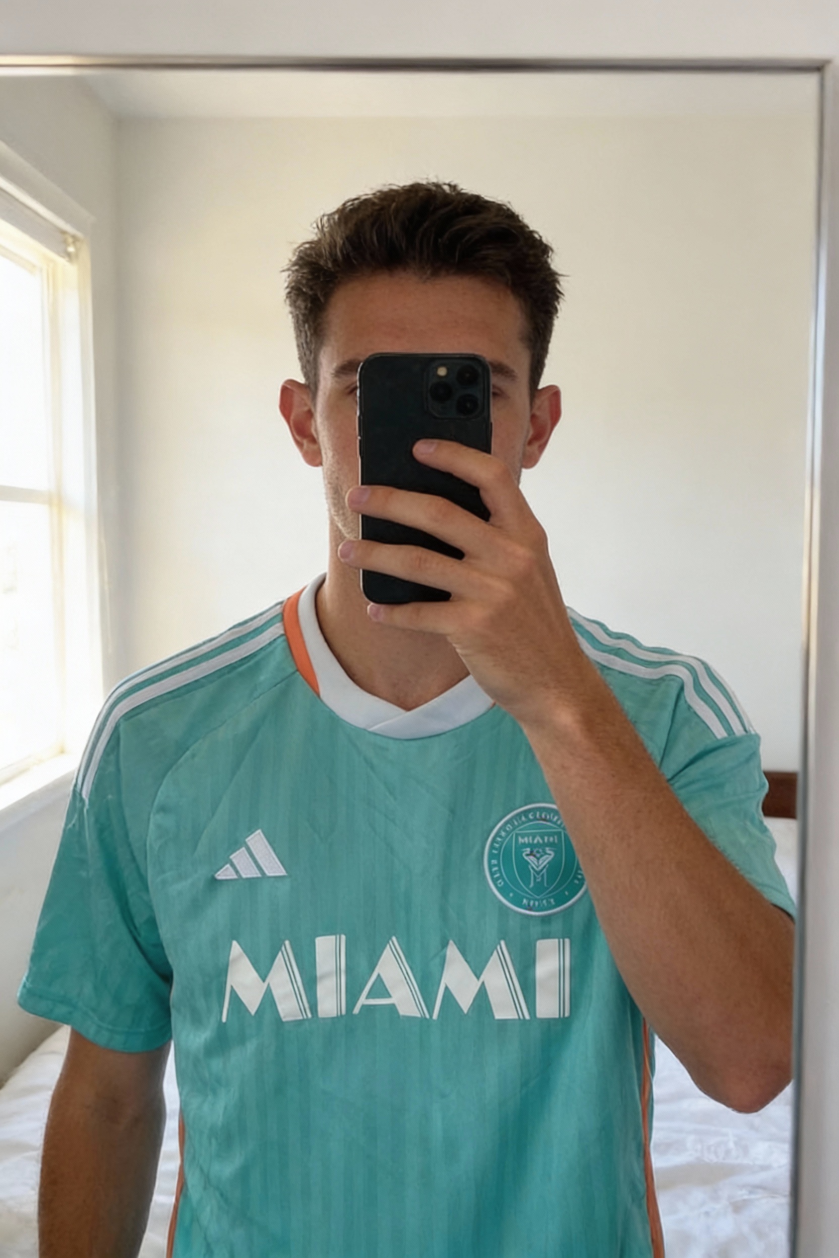 Maillot Adidas Inter Miami debout, face à la caméra, dans une chambre à la lumière douce, avec une lumière naturelle filtrant par la fenêtre.