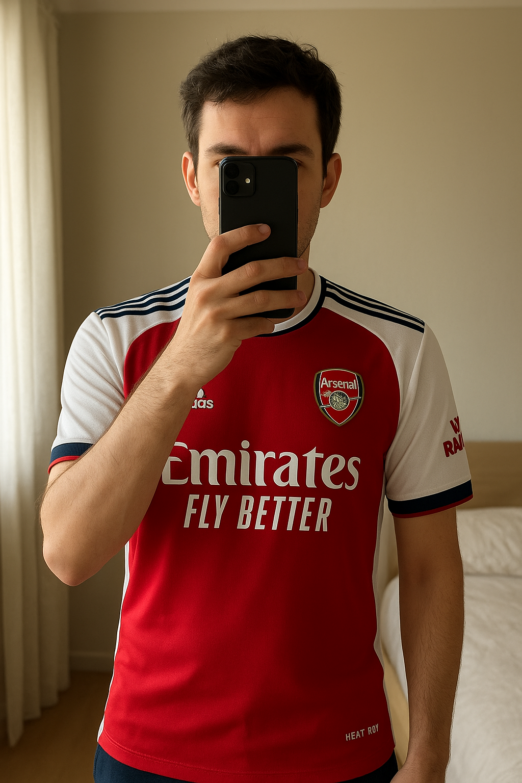 Maillot de Arsenal domicile saison 2024/2025 debout, face à la caméra, dans une chambre à la lumière douce, avec une lumière naturelle filtrant par la fenêtre.