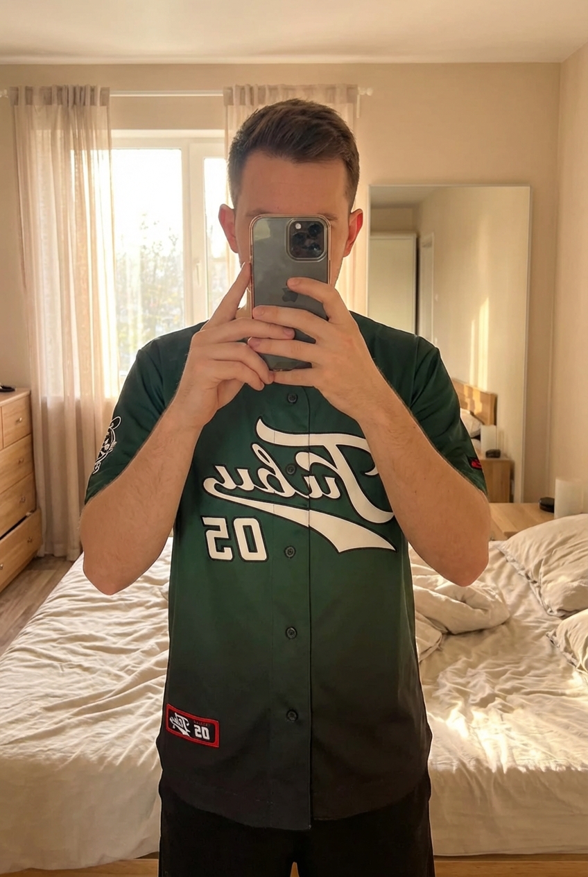 Maillot de baseball FUBU debout, face à la caméra, dans une chambre à la lumière douce, avec une lumière naturelle filtrant par la fenêtre.