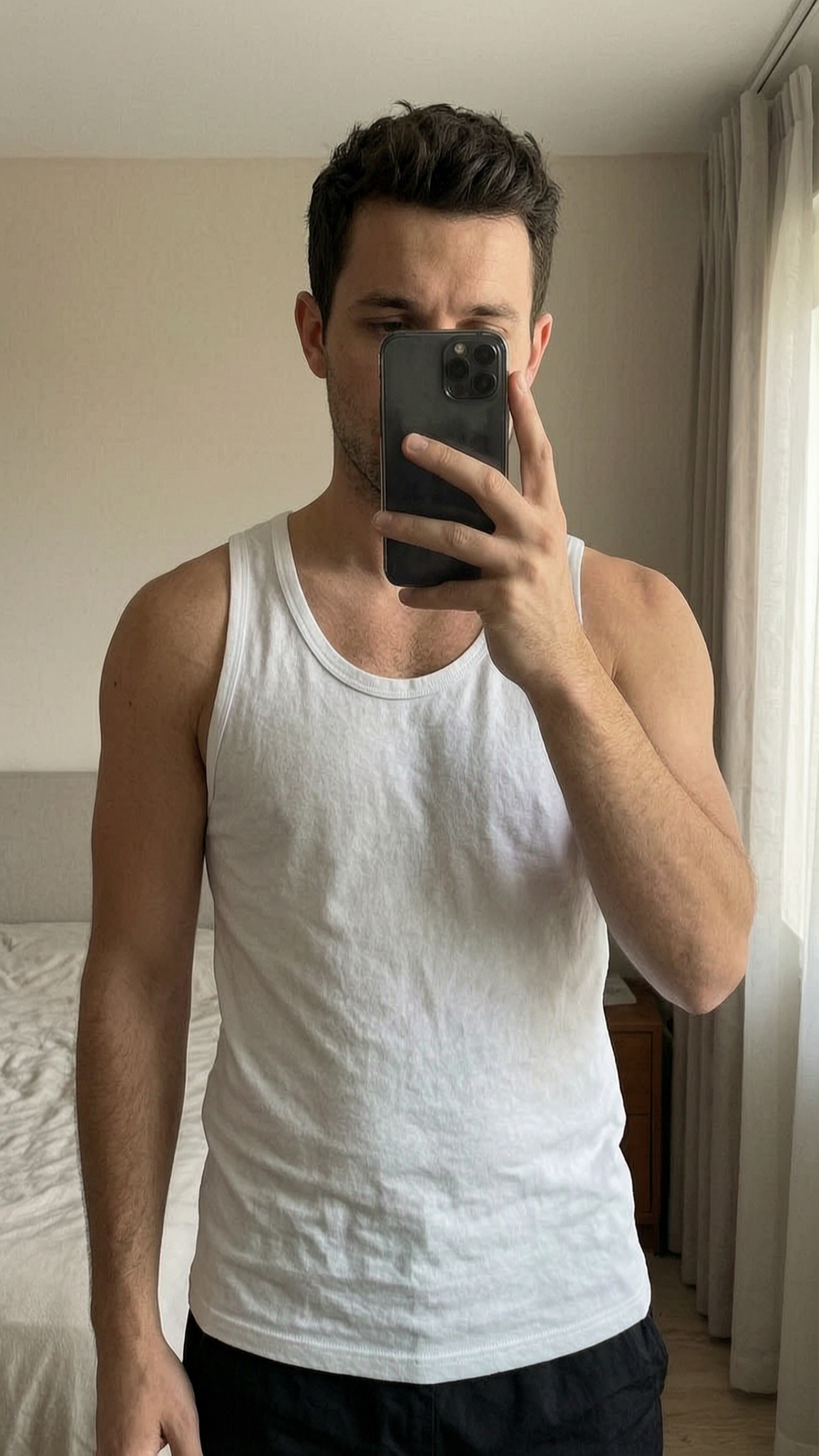 Maillot de corps / débardeur, Fila, Kaporal debout, face à la caméra, dans une chambre à la lumière douce, avec une lumière naturelle filtrant par la fenêtre.