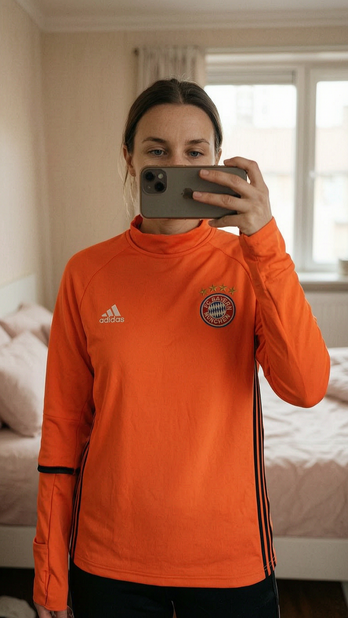 Maillot de sport debout, face à la caméra, dans une chambre à la lumière douce, avec une lumière naturelle filtrant par la fenêtre.