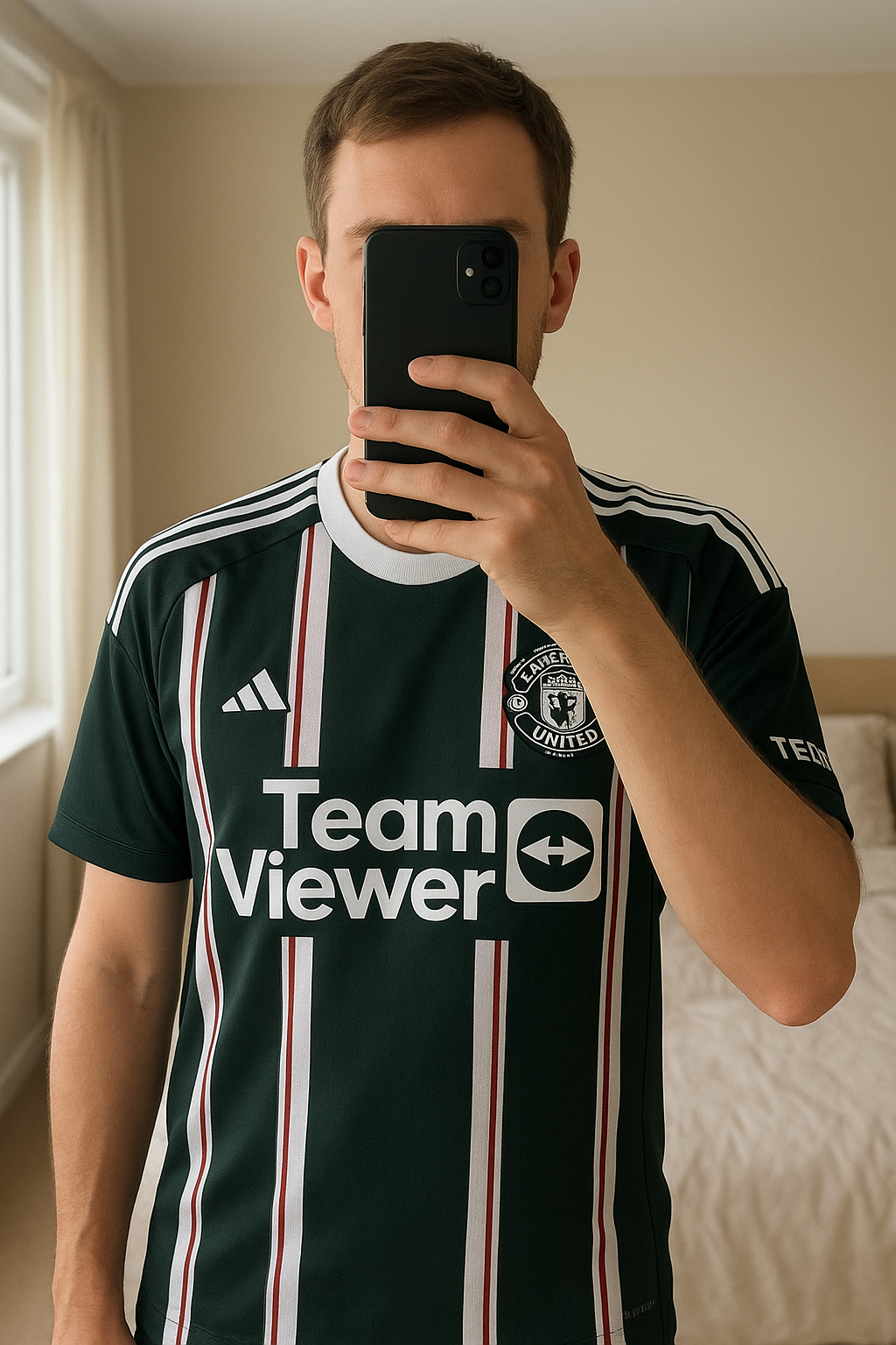 Maillot foot vintage football shirt Manchester United modèle AWAY de la saison 2023-2024 debout, face à la caméra, dans une chambre à la lumière douce, avec une lumière naturelle filtrant par la fenêtre.