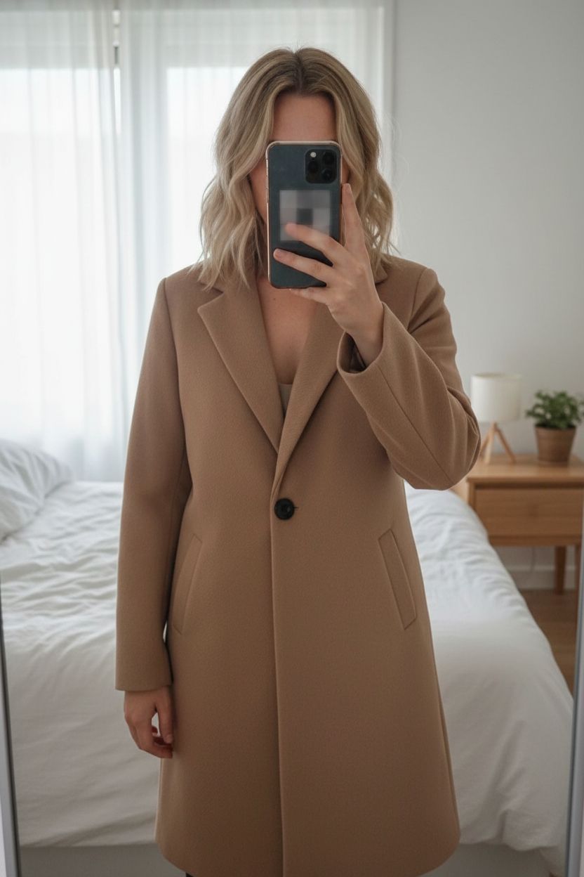 Manteau beige jamais porté debout, face à la caméra, dans une chambre à la lumière douce, avec une lumière naturelle filtrant par la fenêtre.