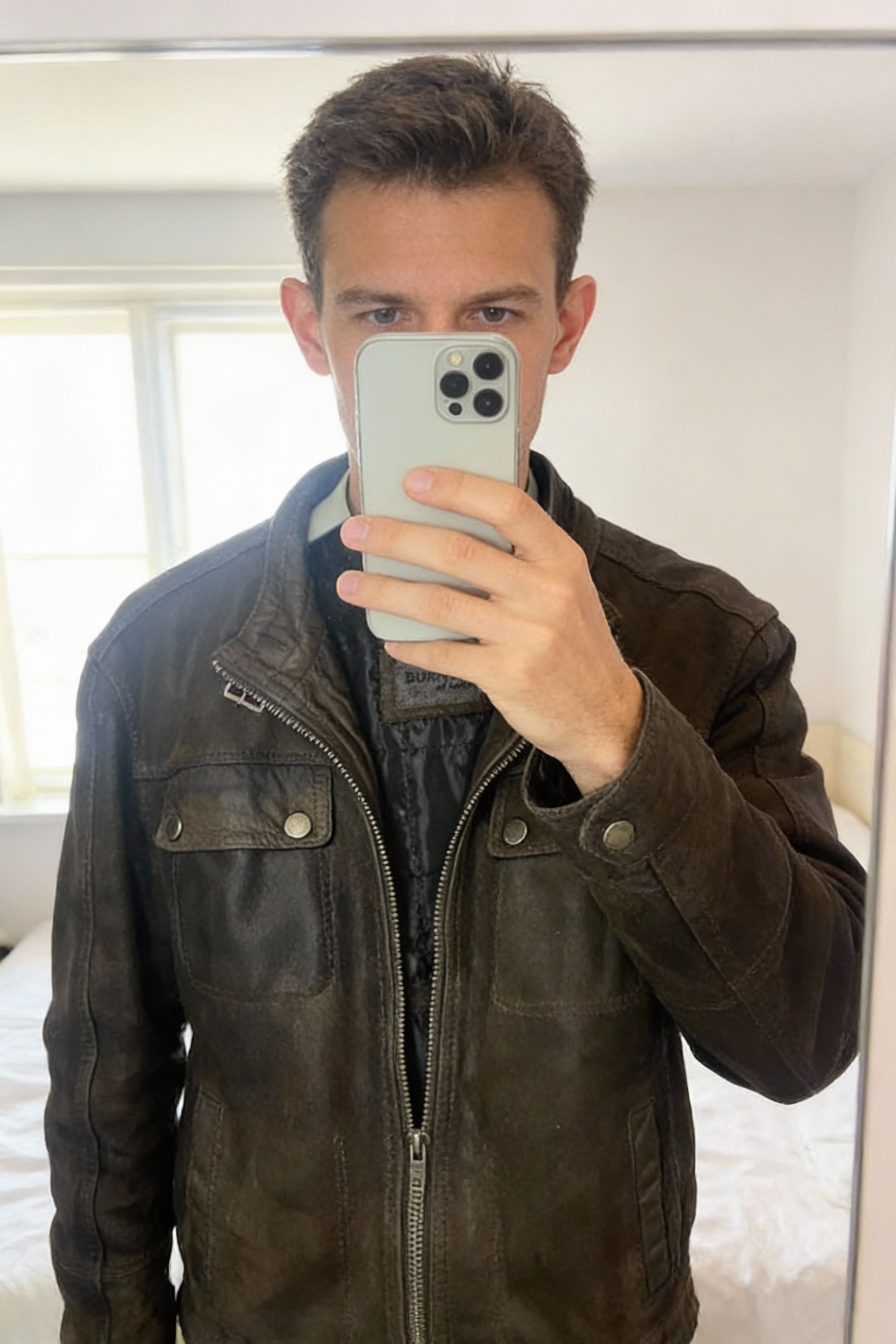 manteau / blouson cuir marron foncé debout, face à la caméra, dans une chambre à la lumière douce, avec une lumière naturelle filtrant par la fenêtre.