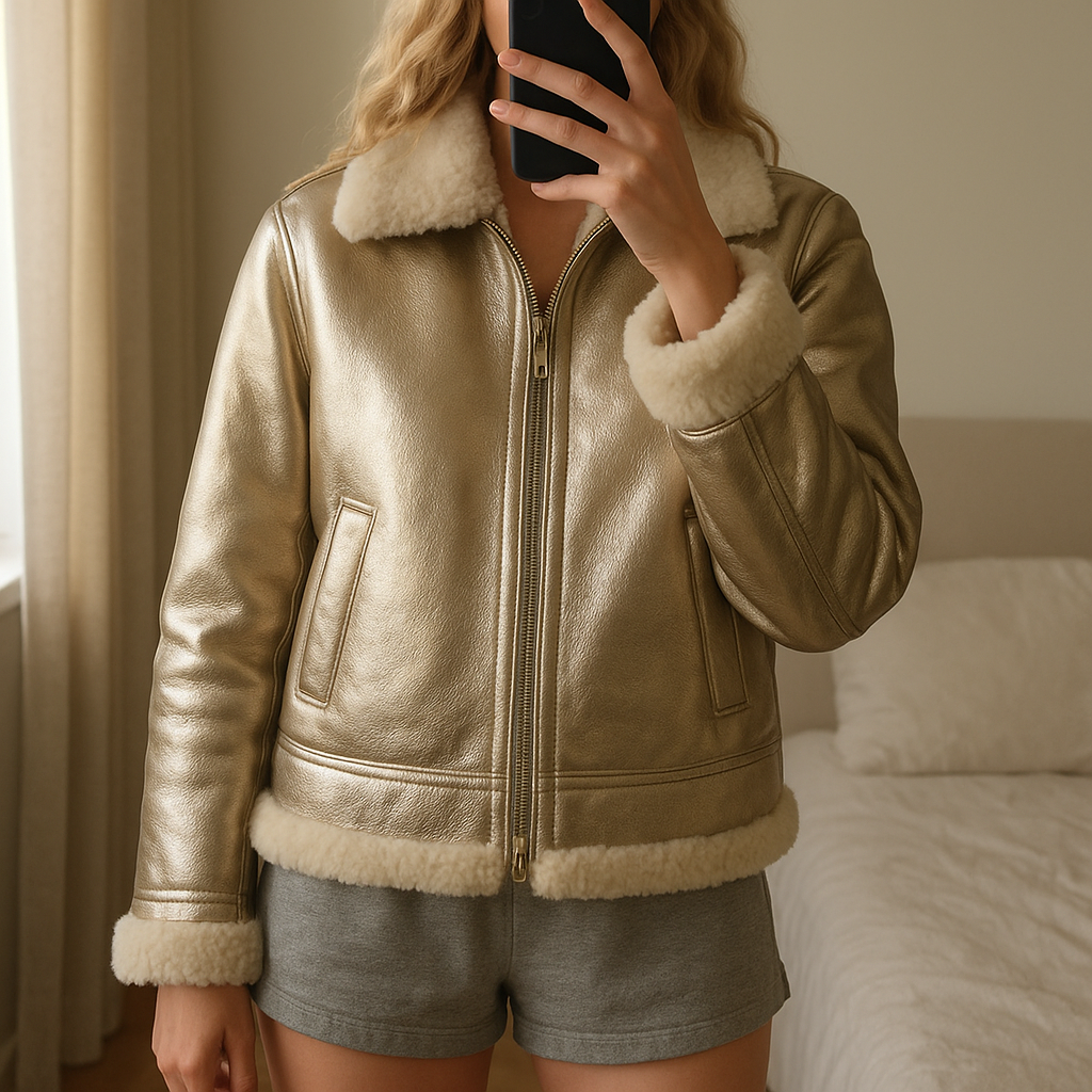 Manteau bombardier brillant Guess doré argenté debout, face à la caméra, dans une chambre à la lumière douce, avec une lumière naturelle filtrant par la fenêtre.