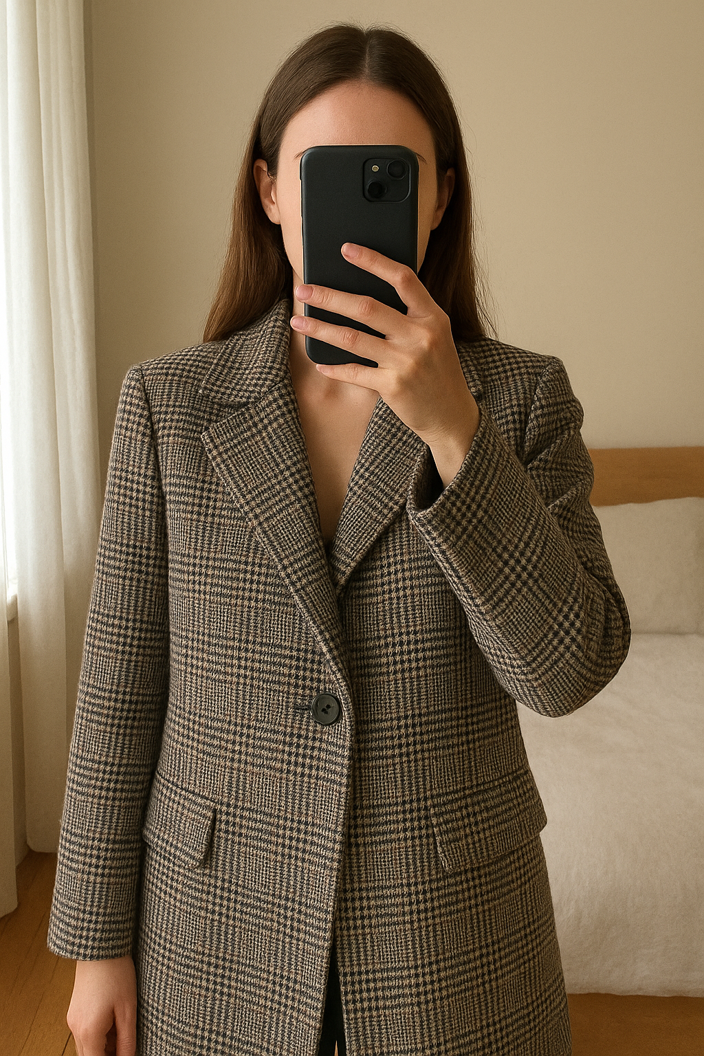 Manteau carreaux marron debout, face à la caméra, dans une chambre à la lumière douce, avec une lumière naturelle filtrant par la fenêtre.