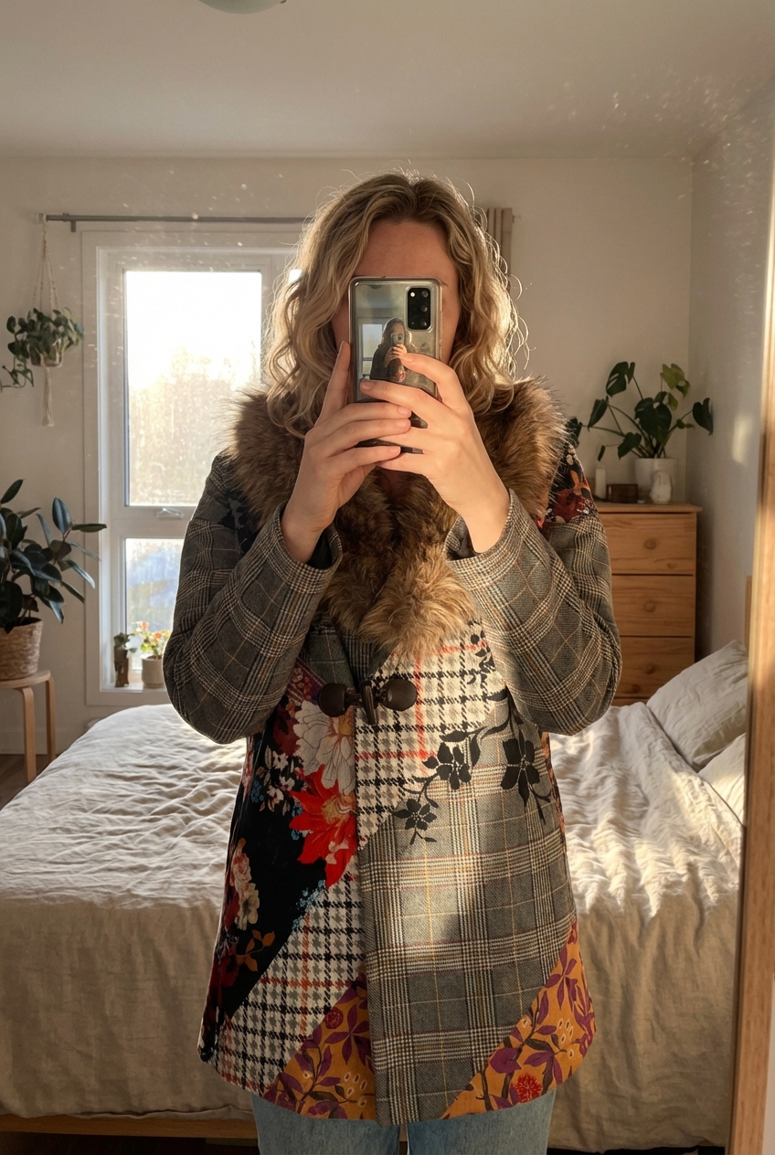 Manteau court (japonisant) doublé fourrure synthétique, petit créateur, taille L/XL debout, face à la caméra, dans une chambre à la lumière douce, avec une lumière naturelle filtrant par la fenêtre.