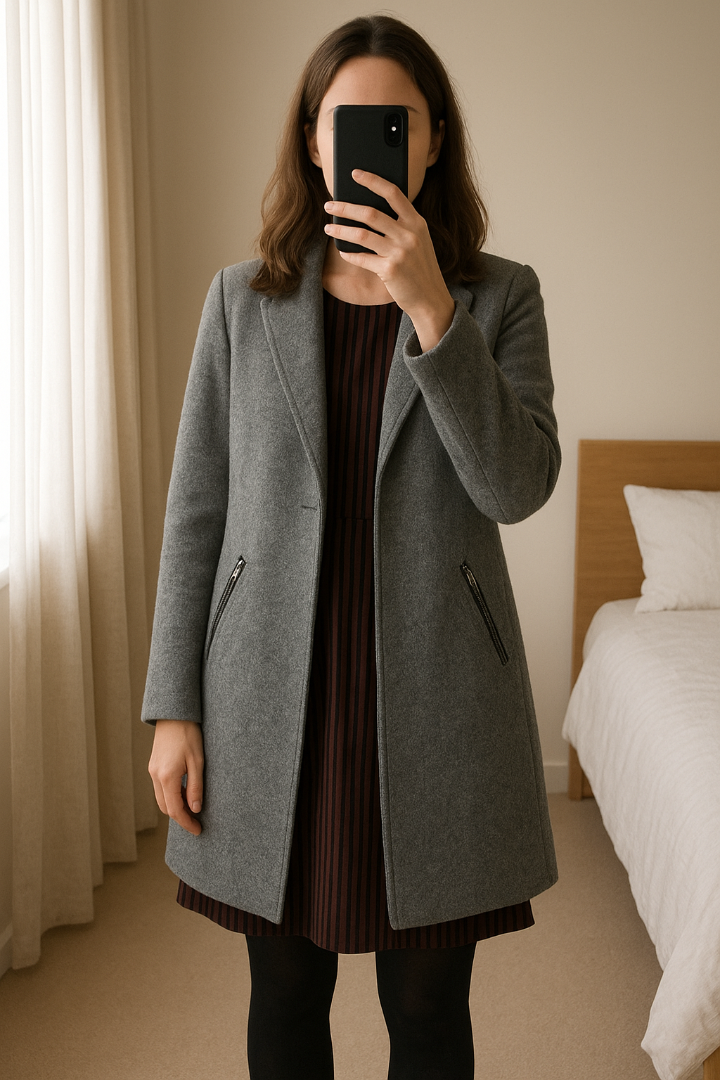 Manteau femme gris neuf debout, face à la caméra, dans une chambre à la lumière douce, avec une lumière naturelle filtrant par la fenêtre.