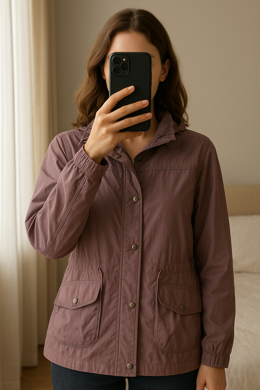 Manteau Femme mauve XXL Sourire Collection debout, face à la caméra, dans une chambre à la lumière douce, avec une lumière naturelle filtrant par la fenêtre.