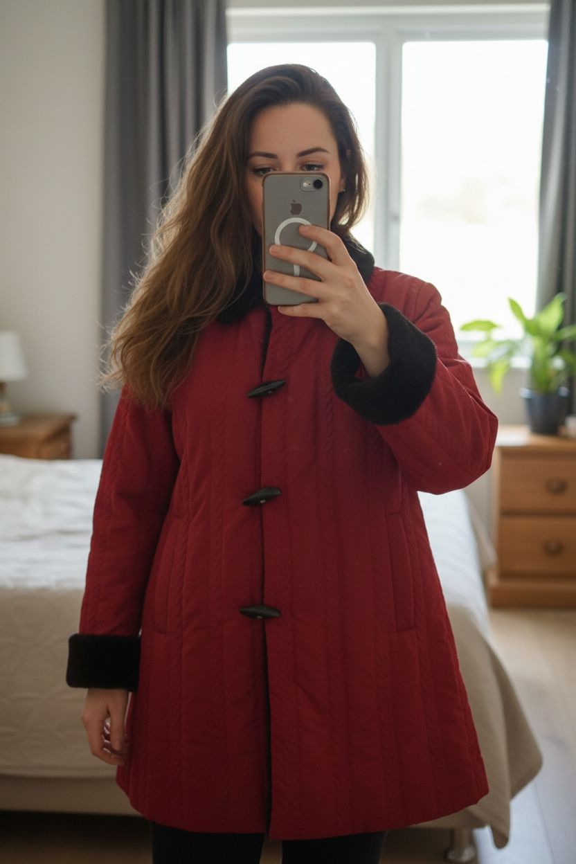 Une personne en Manteau femme rouge Xl debout, face à la caméra, dans une chambre à la lumière douce, avec une lumière naturelle filtrant par la fenêtre.