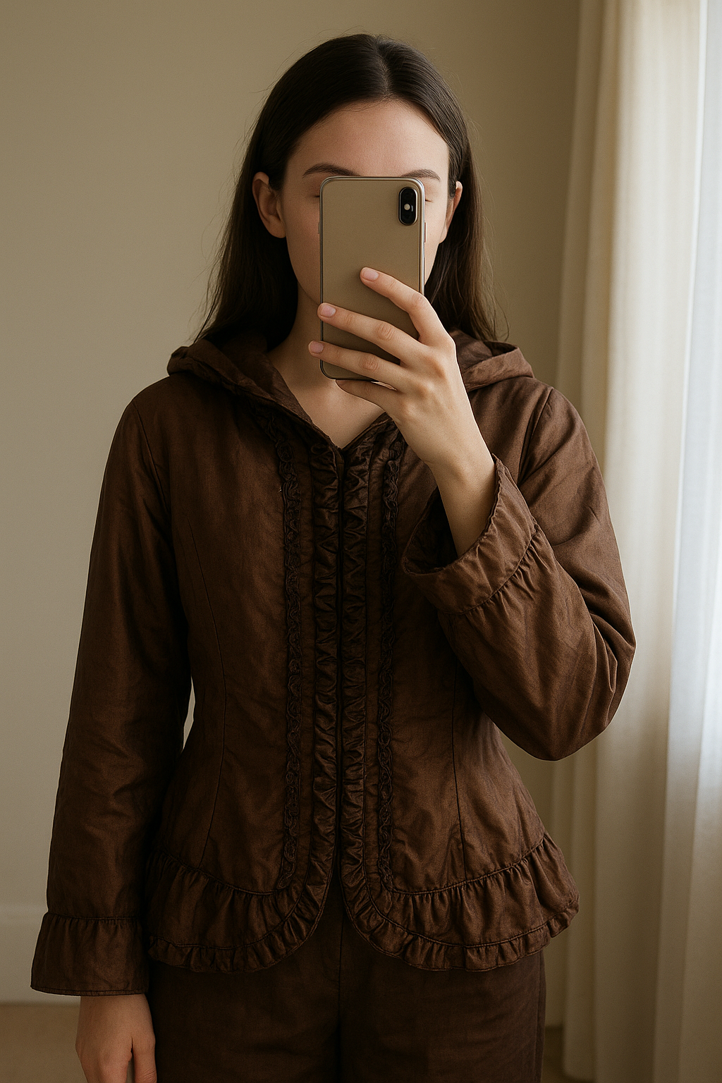Manteau jaqueline riu debout, face à la caméra, dans une chambre à la lumière douce, avec une lumière naturelle filtrant par la fenêtre.