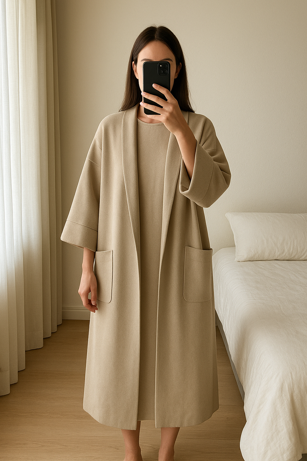 Manteau long beige debout, face à la caméra, dans une chambre à la lumière douce, avec une lumière naturelle filtrant par la fenêtre.