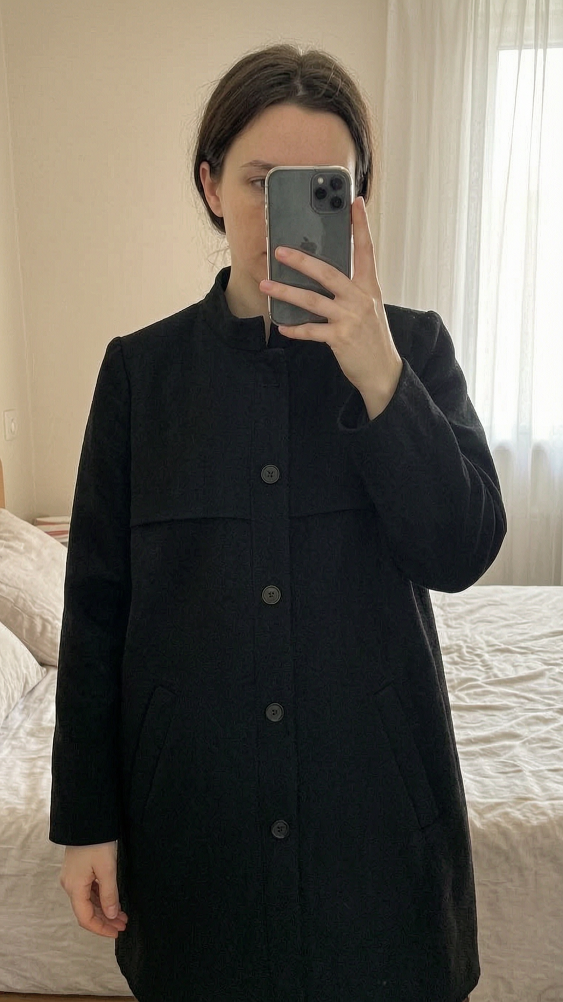 Manteau noir debout, face à la caméra, dans une chambre à la lumière douce, avec une lumière naturelle filtrant par la fenêtre.