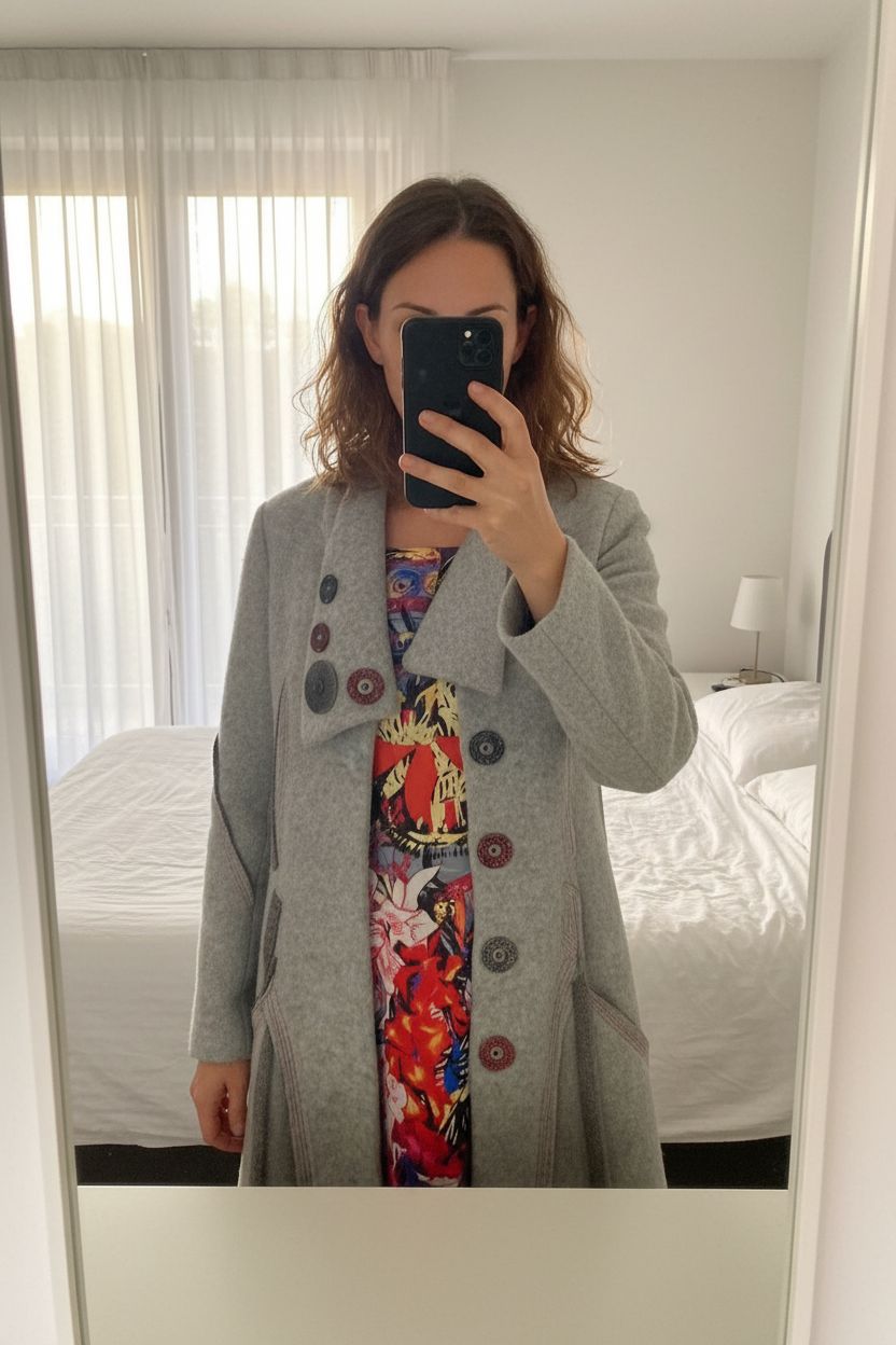 Manteau #savethequeen debout, face à la caméra, dans une chambre à la lumière douce, avec une lumière naturelle filtrant par la fenêtre.