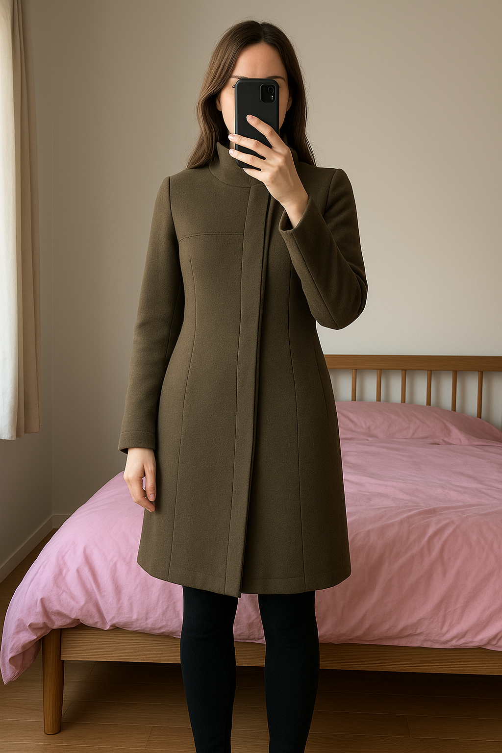 Manteau style militaire vintage debout, face à la caméra, dans une chambre à la lumière douce, avec une lumière naturelle filtrant par la fenêtre.
