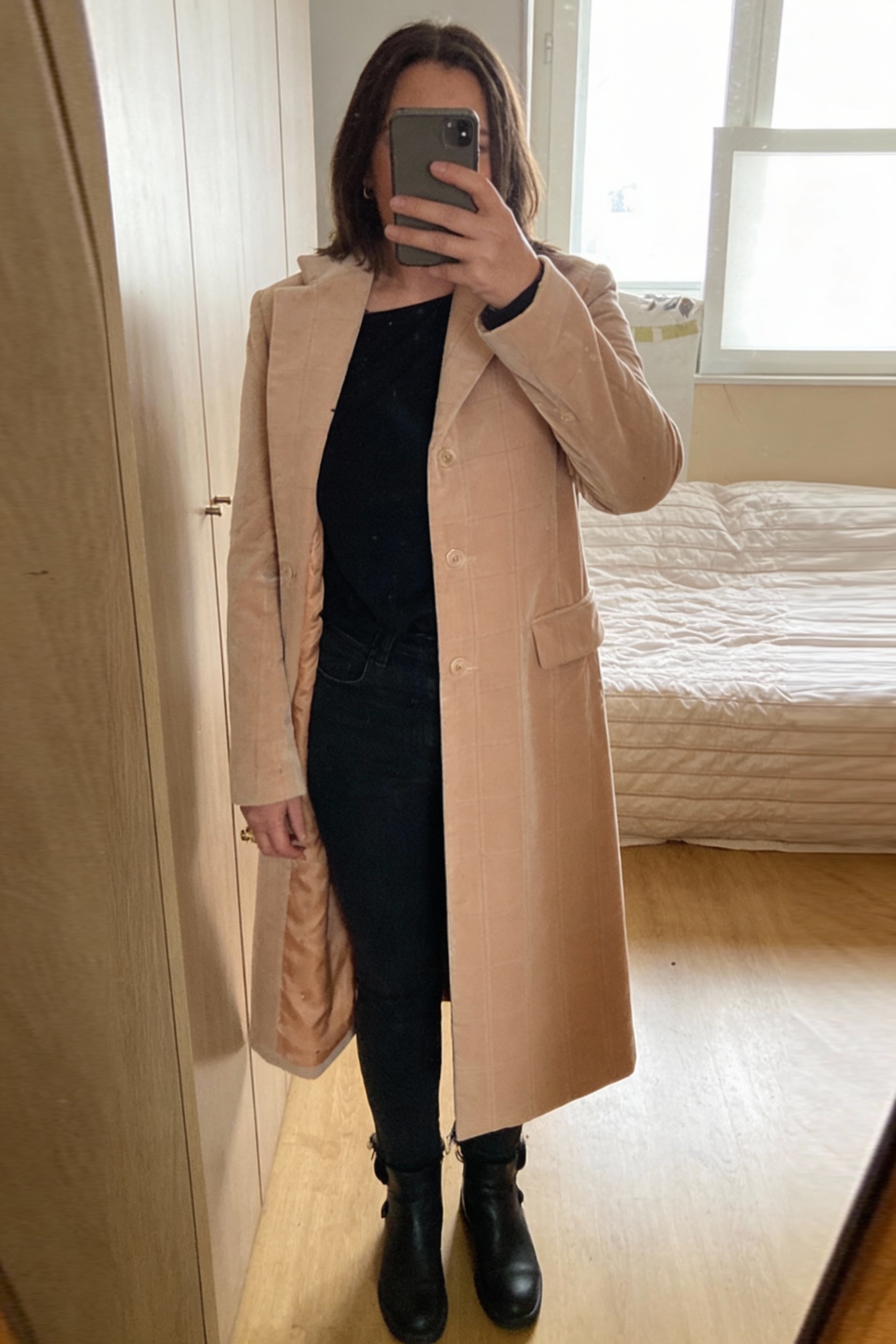 Manteau velours rose nude vintage debout, face à la caméra, dans une chambre à la lumière douce, avec une lumière naturelle filtrant par la fenêtre.