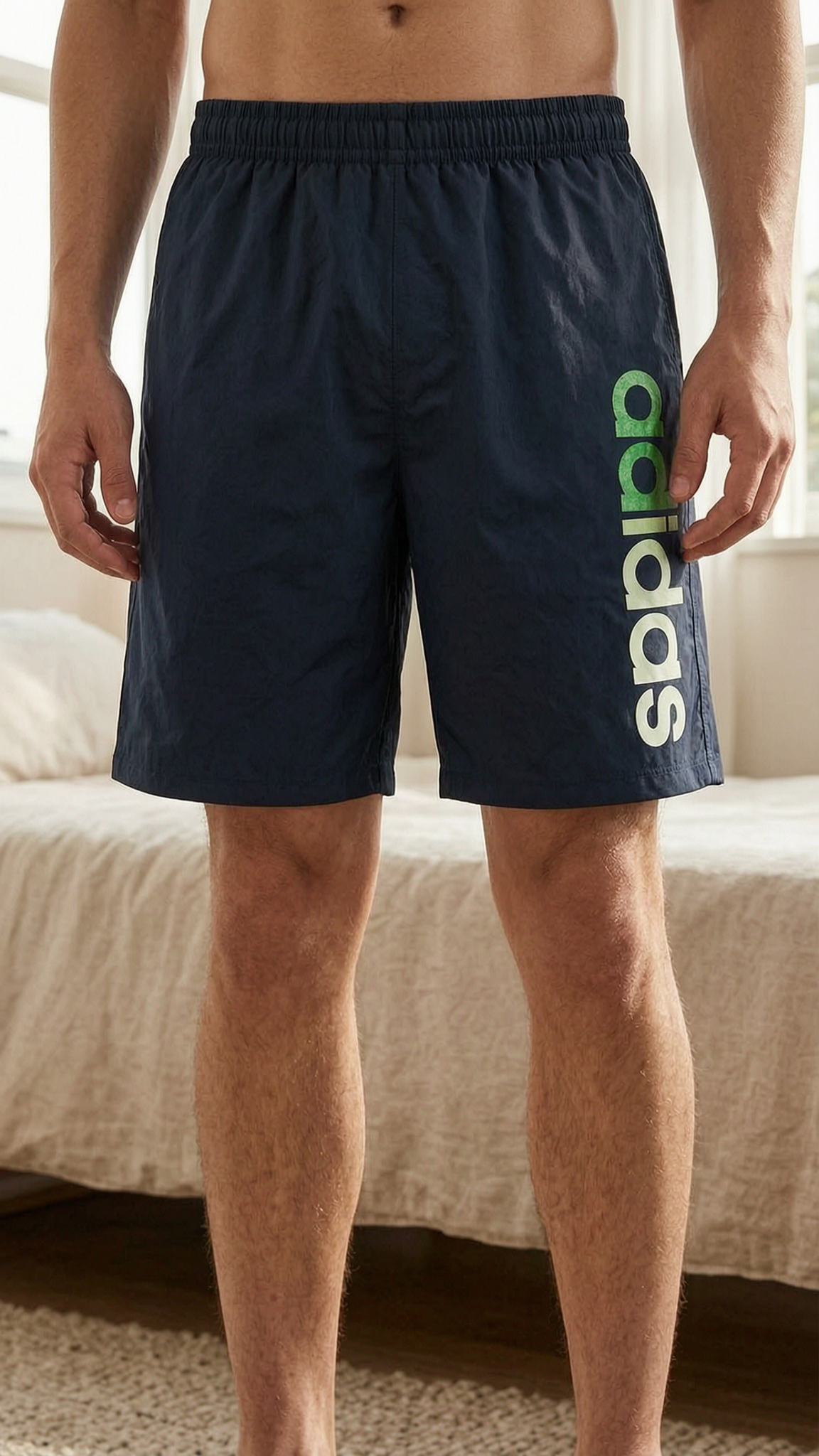 Une personne en Marine short Adidas taille M debout, face à la caméra, dans une chambre à la lumière douce, avec une lumière naturelle filtrant par la fenêtre.