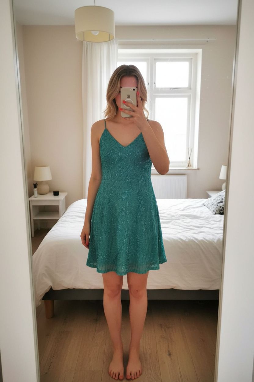 Mini robe vert d eau à sequin Marciano 40 fr debout, face à la caméra, dans une chambre à la lumière douce, avec une lumière naturelle filtrant par la fenêtre.