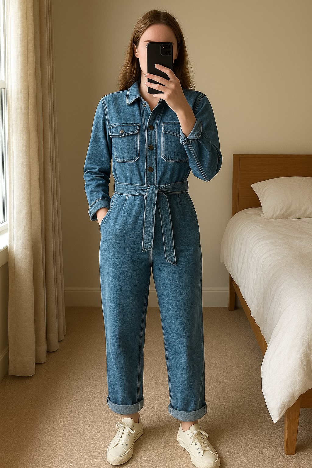 Mode trotter combinaison jean’s debout, face à la caméra, dans une chambre à la lumière douce, avec une lumière naturelle filtrant par la fenêtre.