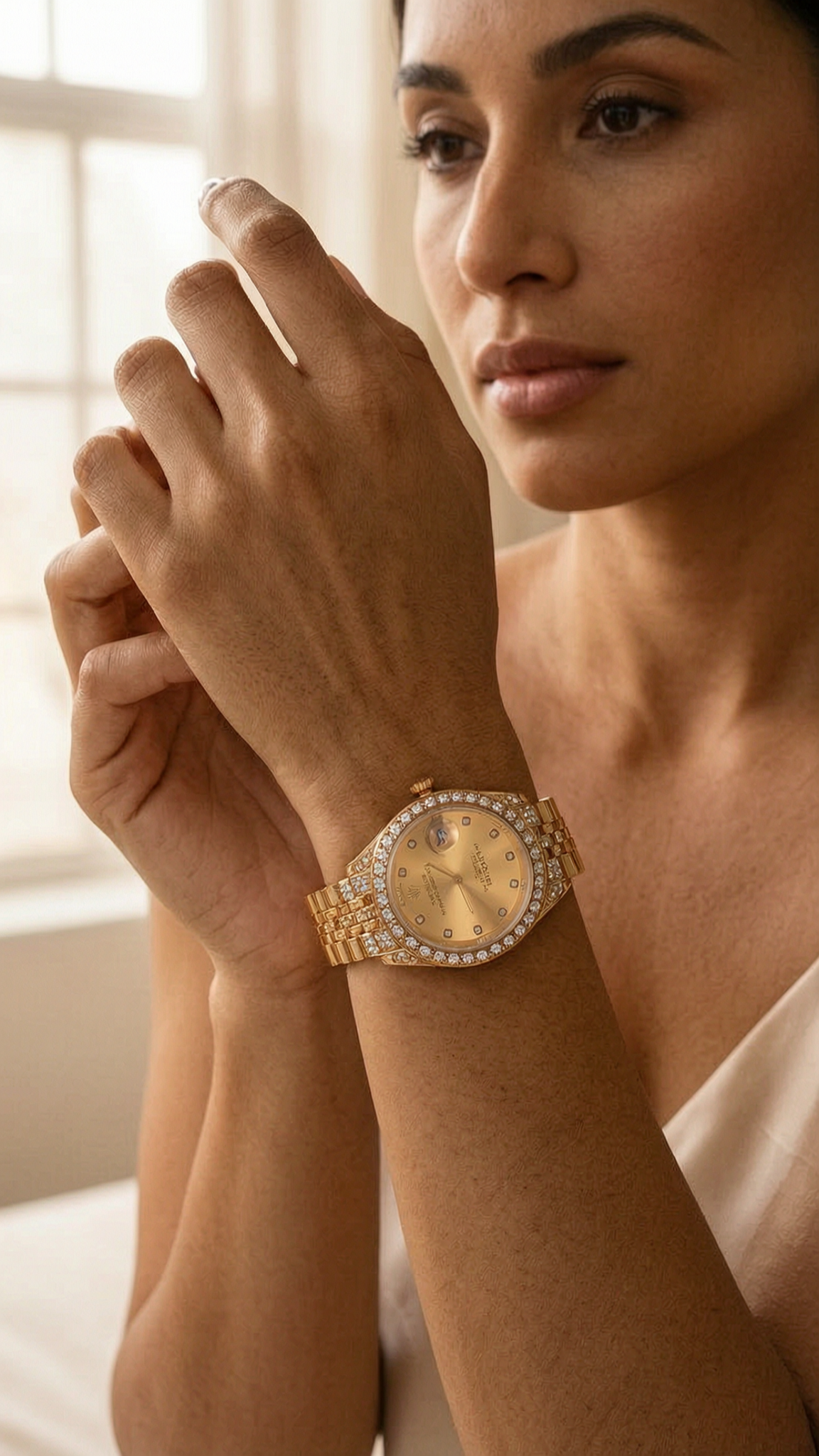 Une personne en Montre femme strass Rolej debout, face à la caméra, dans une chambre à la lumière douce, avec une lumière naturelle filtrant par la fenêtre.