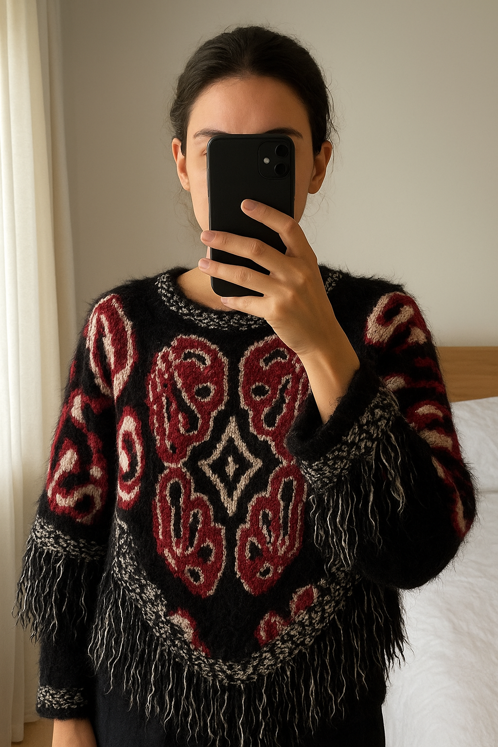 NEU Flauschiger Poncho, one size aufrecht stehend, der Kamera zugewandt, in einem sanft beleuchteten Schlafzimmer, mit natürlichem Licht, das durch ein Fenster fällt.