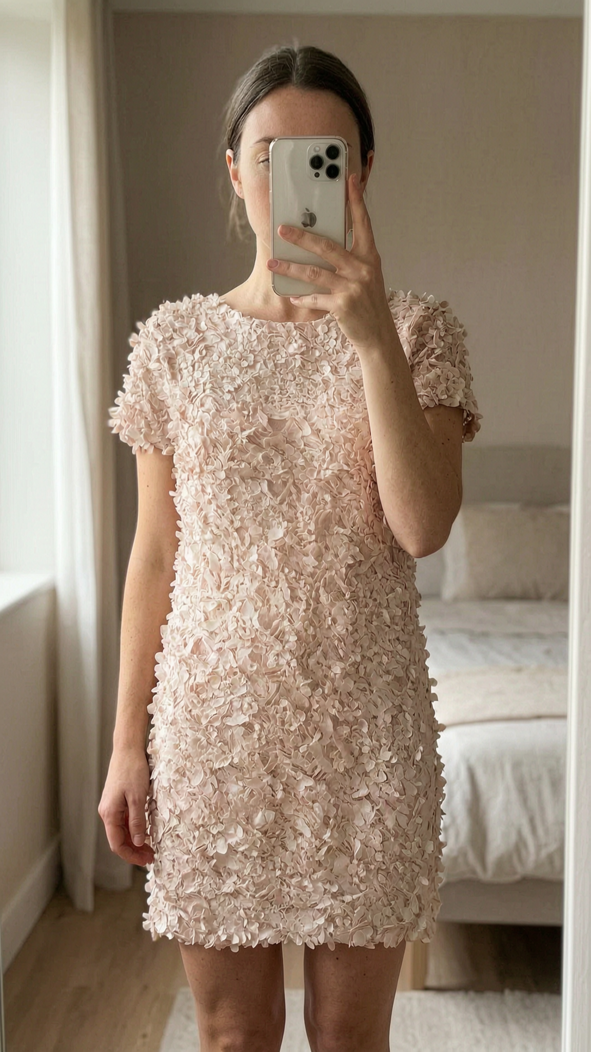 NEXT Blush Pink 3D Floral Occasion Mini Dress Size 6 standing straight facing the camera, in a softly lit bedroom setting, with gentle natural light filtering through a window.