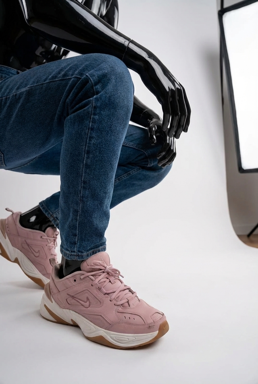 un mannequin noir brillant en plastique, sans traits du visage en Nike Tekno MK2 - homme, bon état accroupi élégamment pour montrer le tombé et le mouvement du vêtement, dans un studio photo épuré avec fond blanc et éclairage doux.