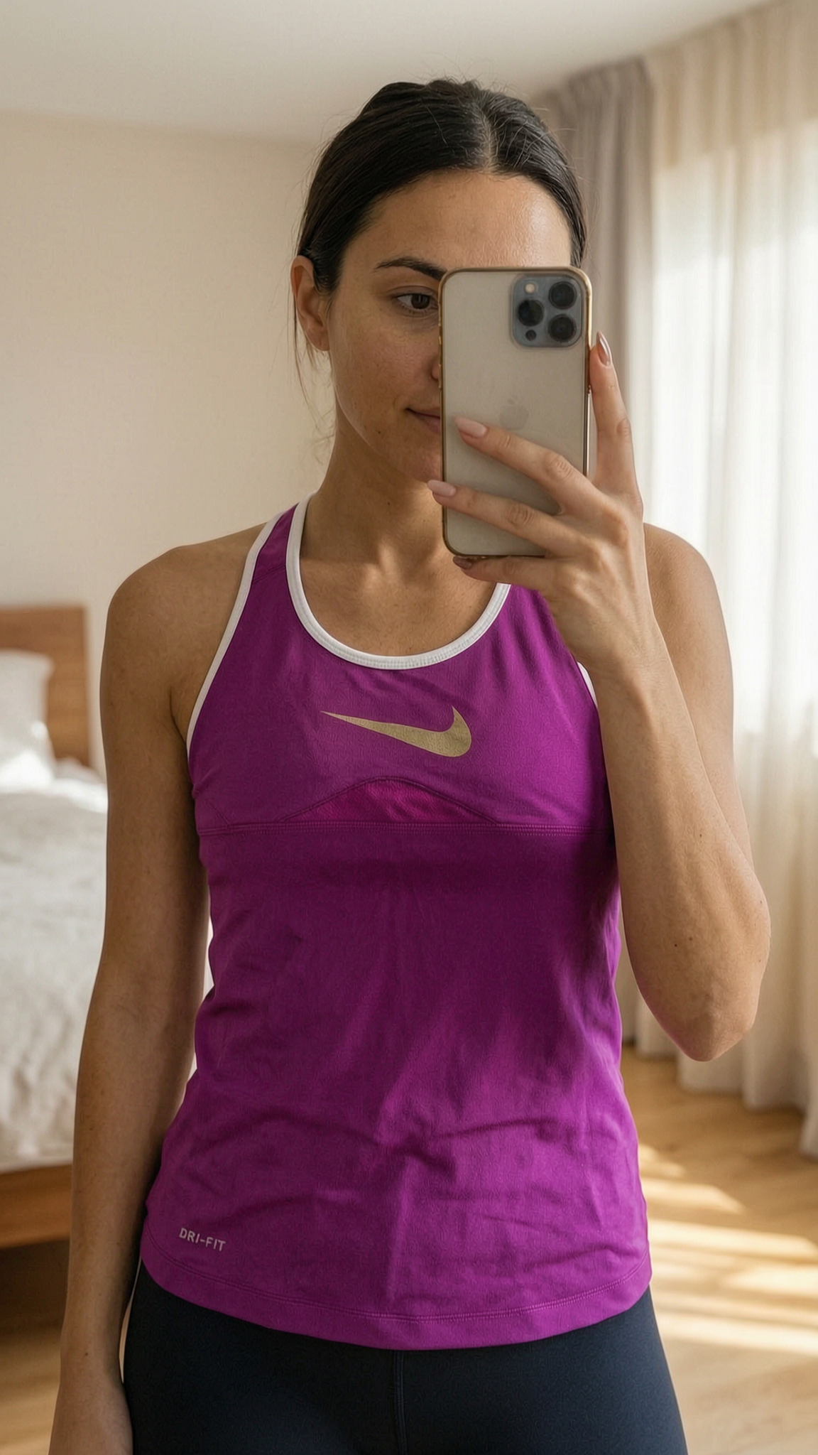 Une personne en Nike Top Vintage Mauve debout, face à la caméra, avec une silhouette fine, dans une chambre à la lumière douce, avec une lumière naturelle filtrant par la fenêtre.