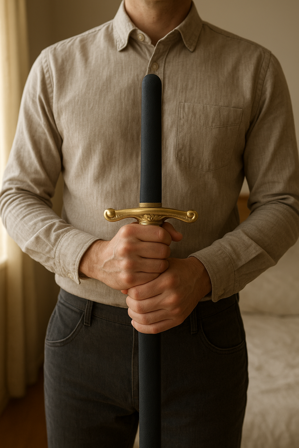 Épée de mousquetaire debout, face à la caméra, dans une chambre à la lumière douce, avec une lumière naturelle filtrant par la fenêtre.