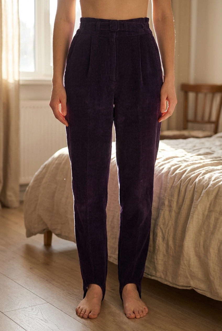 Paarse floeren broek - Fus Europ - maat 36 - goed debout, face à la caméra, dans une chambre à la lumière douce, avec une lumière naturelle filtrant par la fenêtre.