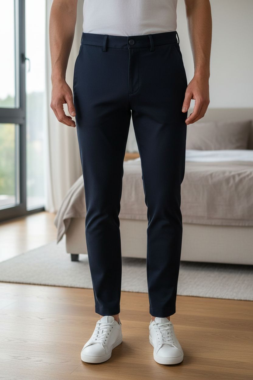 Pantalon 38 Jack et Jones slim Marco – coupe ajustée, style moderne debout, face à la caméra, dans une chambre à la lumière douce, avec une lumière naturelle filtrant par la fenêtre.
